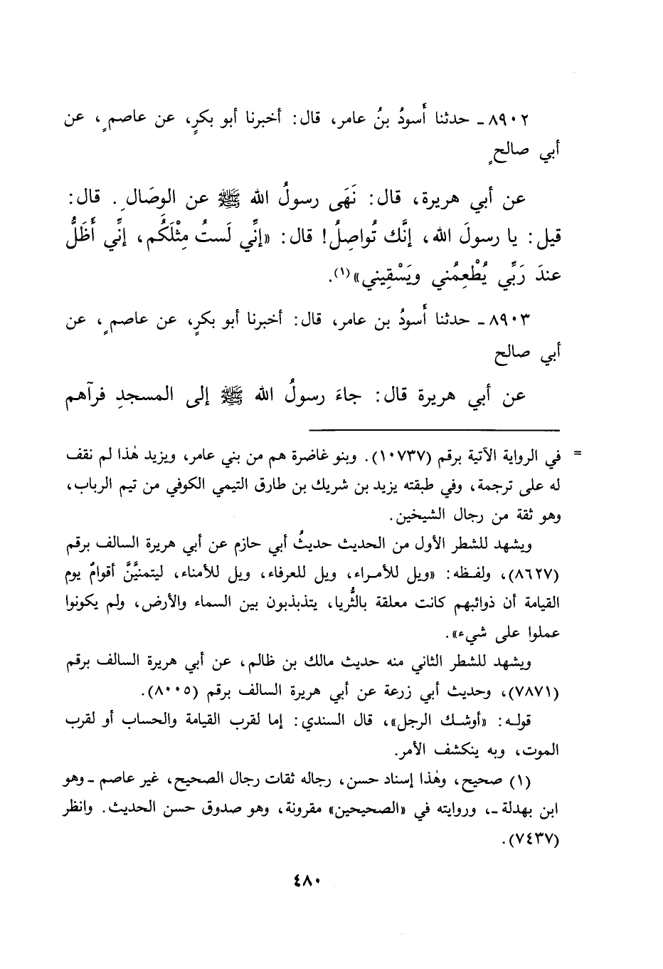 ٨٩٠٢ - حَدَّثَنَا أَسْوَدُ بْنُ عَامِرٍ، قَالَ: أَخْبَرَنَا أَبُو بَكْرٍ، عَنْ عَاصِمٍ، عَنْ أَبِي صَالِحٍ، عَنْ أَبِي هُرَيْرَةَ، قَالَ: نَهَى رَسُولُ اللهِ صَلَّى اللهُ عَلَيْهِ وَسَلَّمَ عَنِ الْوِصَالِ، قَالَ: قِيلَ: يَا رَسُولَ اللهِ، إِنَّكَ تُوَاصِلُ، قَالَ: " إِنِّي لَسْتُ مِثْلَكُمْ، إِنِّي أَظَلُّ عِنْدَ رَبِّي يُطْعِمُنِي وَيَسْقِينِي " (١)