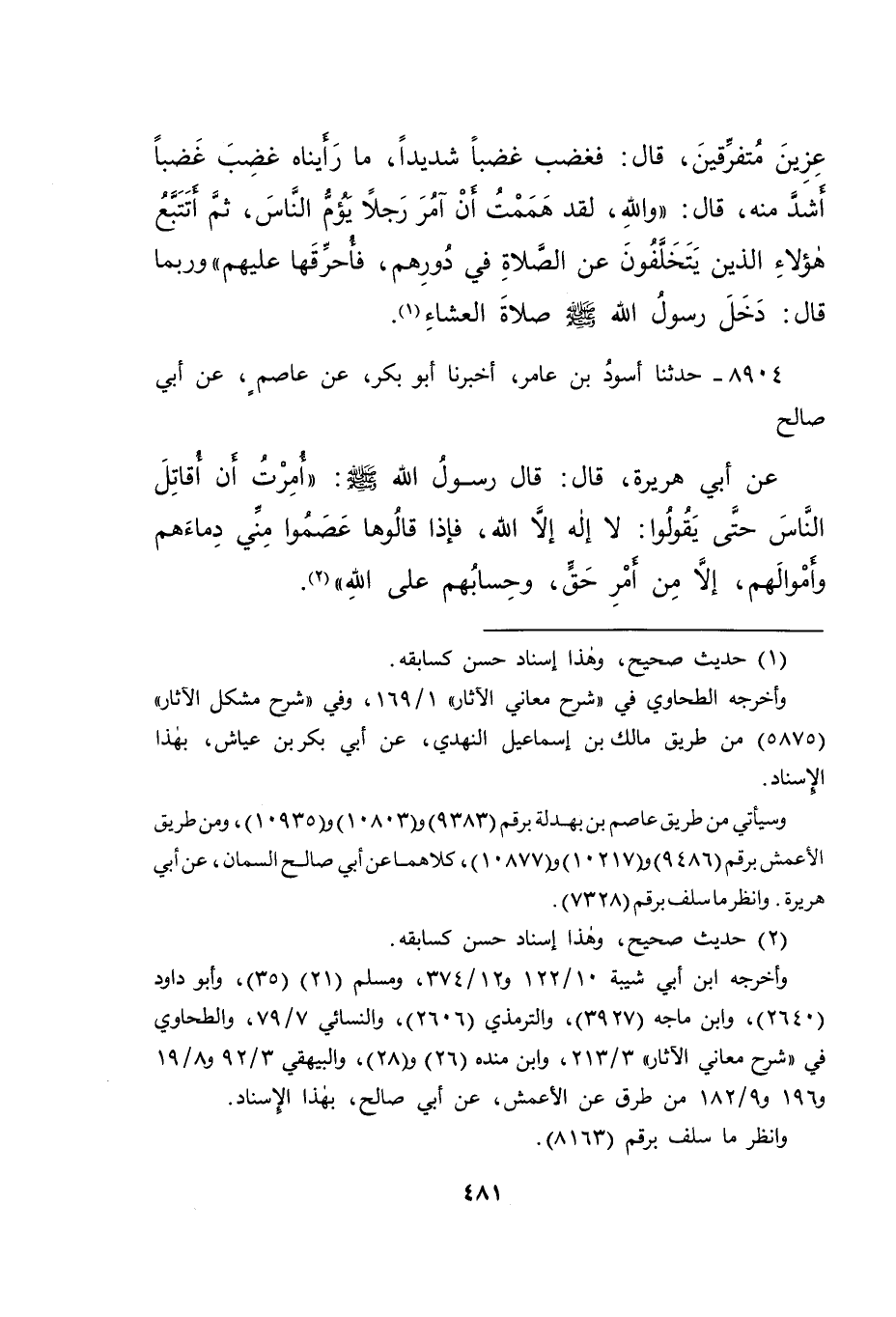 ٨٩٠٤ - حَدَّثَنَا أَسْوَدُ بْنُ عَامِرٍ، أَخْبَرَنَا أَبُو بَكْرٍ، عَنْ عَاصِمٍ، عَنْ أَبِي صَالِحٍ، عَنْ أَبِي هُرَيْرَةَ، قَالَ: قَالَ رَسُولُ اللهِ صَلَّى اللهُ عَلَيْهِ وَسَلَّمَ: " أُمِرْتُ أَنْ أُقَاتِلَ النَّاسَ حَتَّى يَقُولُوا: لَا إِلَهَ إِلَّا اللهُ، فَإِذَا قَالُوهَا، عَصَمُوا مِنِّي دِمَاءَهُمْ وَأَمْوَالَهُمْ إِلَّا مِنْ أَمْرِ حَقٍّ، وَحِسَابُهُمْ عَلَى اللهِ " (٢)