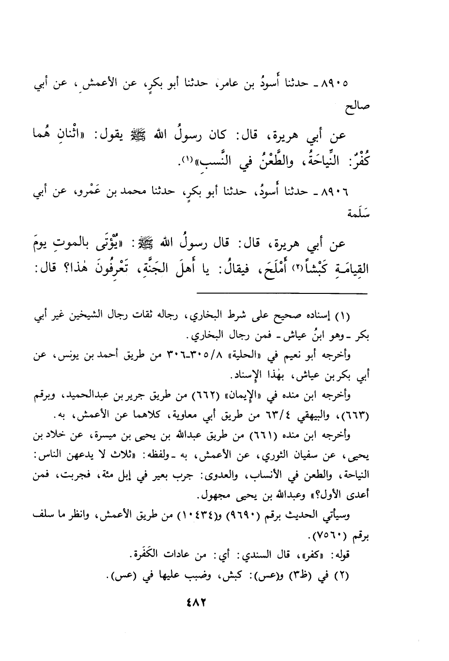 ٨٩٠٥ - حَدَّثَنَا أَسْوَدُ بْنُ عَامِرٍ، حَدَّثَنَا أَبُو بَكْرٍ، عَنِ الْأَعْمَشِ، عَنْ أَبِي صَالِحٍ، عَنْ أَبِي هُرَيْرَةَ، قَالَ: كَانَ رَسُولُ اللهِ صَلَّى اللهُ عَلَيْهِ وَسَلَّمَ يَقُولُ: " اثْنَانِ هُمَا كُفْرٌ: النِّيَاحَةُ، وَالطَّعْنُ فِي النَّسَبِ " (١)