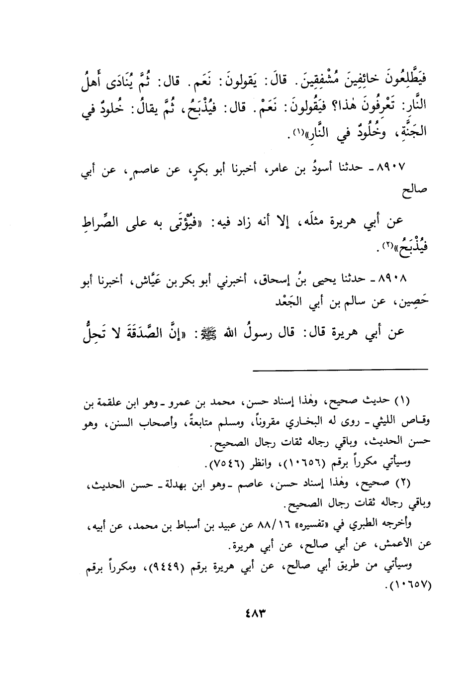 ٨٩٠٧ - حَدَّثَنَا أَسْوَدُ بْنُ عَامِرٍ، أَخْبَرَنَا أَبُو بَكْرٍ، عَنْ عَاصِمٍ، عَنْ أَبِي صَالِحٍ، عَنْ أَبِي هُرَيْرَةَ مِثْلَهُ، إِلَّا أَنَّهُ زَادَ فِيهِ: " فَيُؤْتَى بِهِ عَلَى الصِّرَاطِ فَيُذْبَحُ " (٢)