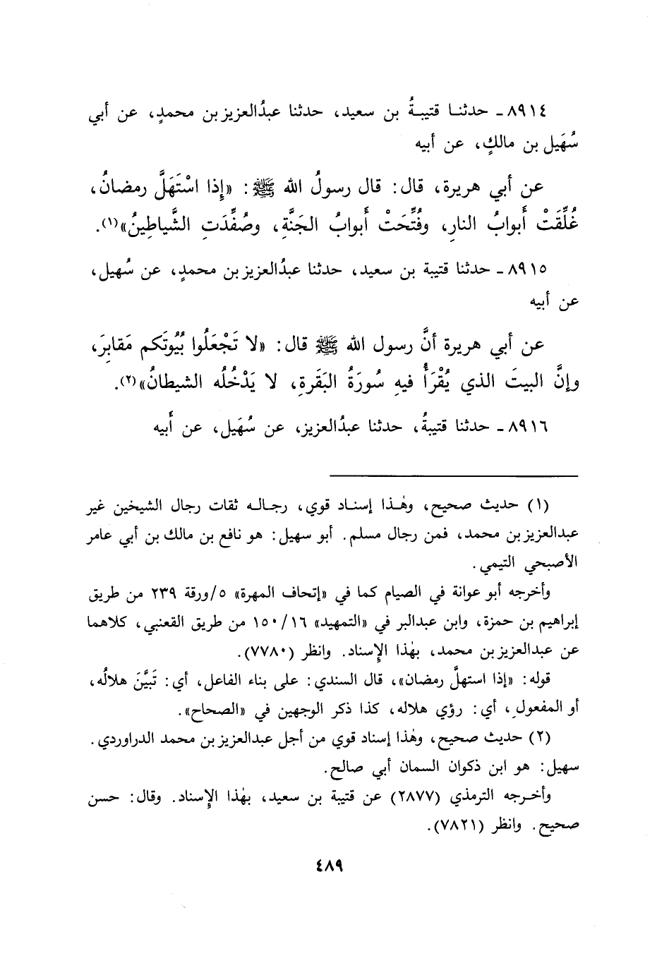 ٨٩١٤ - حَدَّثَنَا قُتَيْبَةُ بْنُ سَعِيدٍ، حَدَّثَنَا عَبْدُ الْعَزِيزِ بْنُ مُحَمَّدٍ، عَنْ أَبِي سُهَيْلِ بْنِ مَالِكٍ، عَنْ أَبِيهِ، عَنْ أَبِي هُرَيْرَةَ، قَالَ: قَالَ رَسُولُ اللهِ صَلَّى اللهُ عَلَيْهِ وَسَلَّمَ: " إِذَا اسْتَهَلَّ رَمَضَانُ، غُلِّقَتْ أَبْوَابُ النَّارِ، وَفُتِّحَتْ أَبْوَابُ الْجَنَّةِ، وَصُفِّدَتِ الشَّيَاطِينُ " (١)