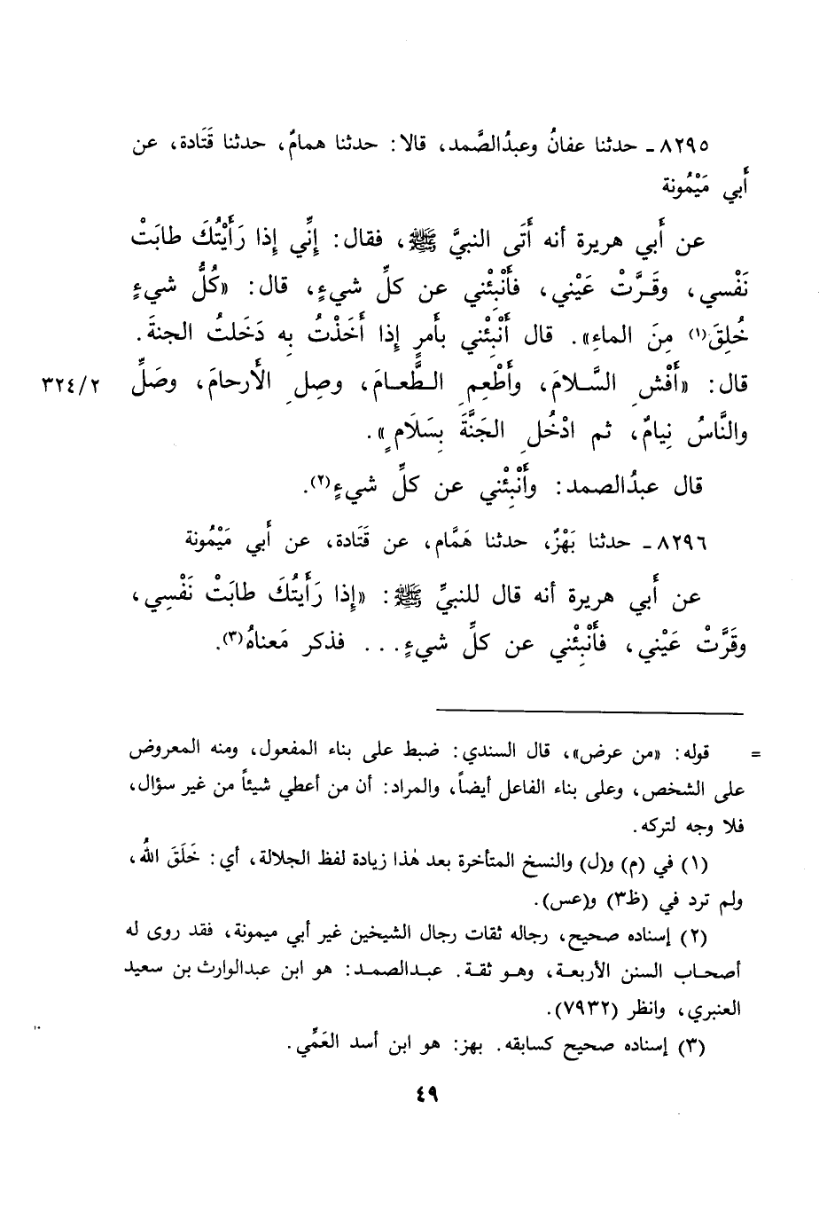 ٨٢٩٦ - حَدَّثَنَا بَهْزٌ، حَدَّثَنَا هَمَّامٌ، عَنْ قَتَادَةَ، عَنْ أَبِي مَيْمُونَةَ، عَنْ أَبِي هُرَيْرَةَ، أَنَّهُ قَالَ لِلنَّبِيِّ صَلَّى اللهُ عَلَيْهِ وَسَلَّمَ: إِذَا رَأَيْتُكَ طَابَتْ نَفْسِي، وَقَرَّتْ عَيْنِي، فَأَنْبِئْنِي عَنْ كُلِّ شَيْءٍ، فَذَكَرَ مَعْنَاهُ