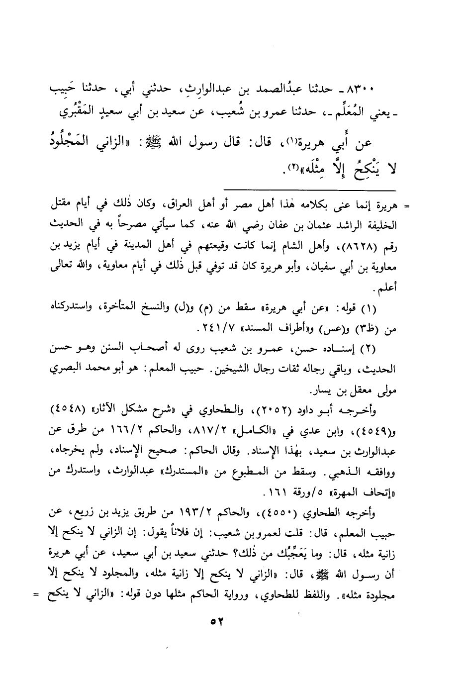 ٨٣٠٠ - حَدَّثَنَا عَبْدُ الصَّمَدِ بْنُ عَبْدِ الْوَارِثِ، حَدَّثَنِي أَبِي، حَدَّثَنَا حَبِيبٌ يَعْنِي الْمُعَلِّمَ، حَدَّثَنَا عَمْروُ بْنُ شُعَيْبٍ، عَنْ سَعِيدِ بْنِ أَبِي سَعِيدٍ الْمَقْبُرِيِّ، عَنْ أَبِي هُرَيْرَةَ (١) ، قَالَ: قَالَ رَسُولُ اللهِ صَلَّى اللهُ عَلَيْهِ وَسَلَّمَ: " الزَّانِي الْمَجْلُودُ لَا يَنْكِحُ إِلَّا مِثْلَهُ " (٢)