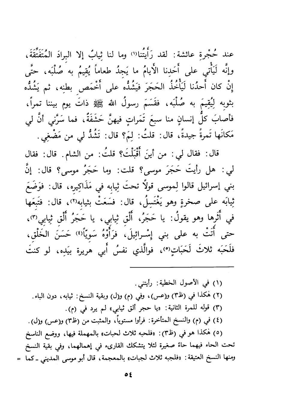 قَالَ: فَقَالَ لِي: " مِنْ أَيْنَ أَقْبَلْتَ؟ " قُلْتُ: مِنَ الشَّامِ. قَالَ: فَقَالَ لِي: " هَلْ رَأَيْتَ حَجَرَ مُوسَى؟ " قُلْتُ: وَمَا حَجَرُ مُوسَى؟ قَالَ: " إِنَّ بَنِي إِسْرَائِيلَ قَالُوا لِمُوسَى قَوْلًا تَحْتَ ثِيَابِهِ فِي مَذَاكِيرِهِ "، قَالَ: " فَوَضَعَ ثِيَابَهُ عَلَى صَخْرَةٍ وَهُوَ يَغْتَسِلُ "، قَالَ: " فَسَعَتْ بِثِيَابِهِ (٢) "، قَالَ: " فَتَبِعَهَا فِي أَثَرِهَا وَهُوَ يَقُولُ: يَا حَجَرُ، أَلْقِ ثِيَابِي، يَا حَجَرُ، أَلْقِ ثِيَابِي (٣) ، حَتَّى أَتَتْ بِهِ عَلَى بَنِي إِسْرَائِيلَ، فَرَأَوْهُ سَوِيًّا (٤) حَسَنَ الْخَلْقِ، فَلَحَبَهُ ثَلَاثَ لَحَبَاتٍ " (٥) ، فَوَالَّذِي نَفْسُ أَبِي هُرَيْرَةَ بِيَدِهِ، " لَوْ كُنْتُ