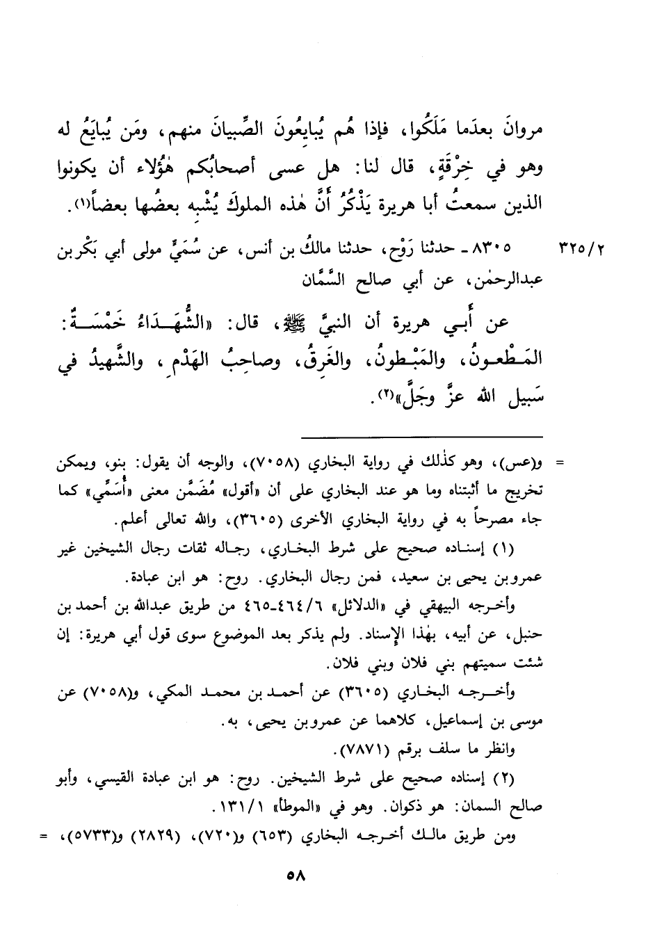 ٨٣٠٥ - حَدَّثَنَا رَوْحٌ، حَدَّثَنَا مَالِكُ بْنُ أَنَسٍ، عَنْ سُمَيٍّ، مَوْلَى أَبِي بَكْرِ بْنِ عَبْدِ الرَّحْمَنِ، عَنْ أَبِي صَالِحٍ السَّمَّانِ، عَنْ أَبِي هُرَيْرَةَ، أَنَّ النَّبِيَّ صَلَّى اللهُ عَلَيْهِ وَسَلَّمَ قَالَ: " الشُّهَدَاءُ خَمْسَةٌ: الْمَطْعُونُ، وَالْمَبْطُونُ، وَالْغَرِقُ، وَصَاحِبُ الْهَدْمِ، وَالشَّهِيدُ فِي سَبِيلِ اللهِ عَزَّ وَجَلَّ " (٢)
