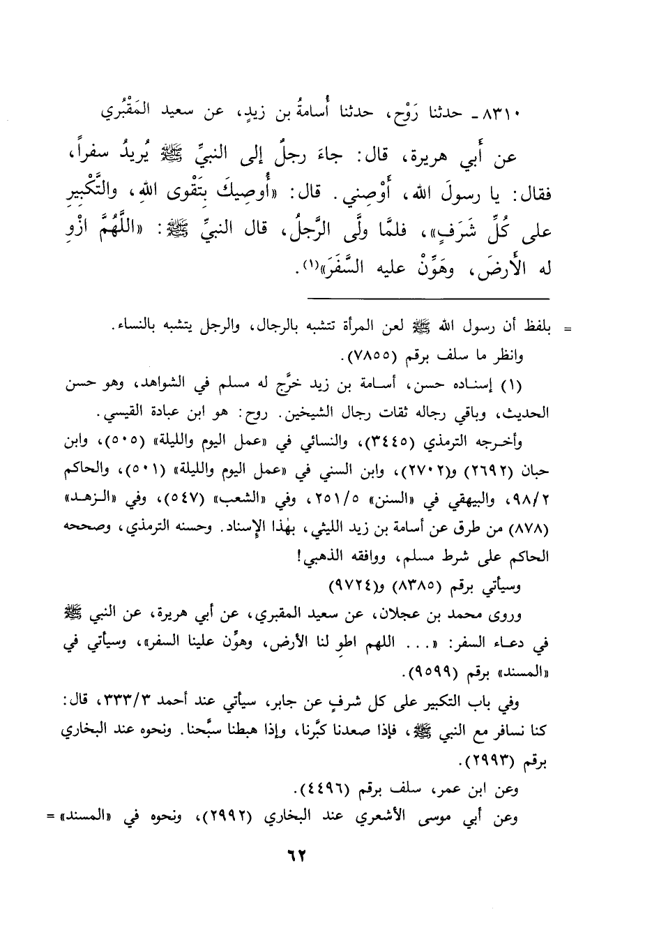 ٨٣١٠ - حَدَّثَنَا رَوْحٌ، حَدَّثَنَا أُسَامَةُ بْنُ زَيْدٍ، عَنْ سَعِيدٍ الْمَقْبُرِيِّ، عَنْ أَبِي هُرَيْرَةَ، قَالَ: جَاءَ رَجُلٌ إِلَى النَّبِيِّ صَلَّى اللهُ عَلَيْهِ وَسَلَّمَ يُرِيدُ سَفَرًا، فَقَالَ: يَا رَسُولَ اللهِ، أَوْصِنِي. قَالَ: " أُوصِيكَ بِتَقْوَى اللهِ، وَالتَّكْبِيرِ عَلَى كُلِّ شَرَفٍ " فَلَمَّا وَلَّى الرَّجُلُ، قَالَ النَّبِيُّ صَلَّى اللهُ عَلَيْهِ وَسَلَّمَ: " اللهُمَّ ازْوِ لَهُ الْأَرْضَ، وَهَوِّنْ عَلَيْهِ السَّفَرَ " (١)
