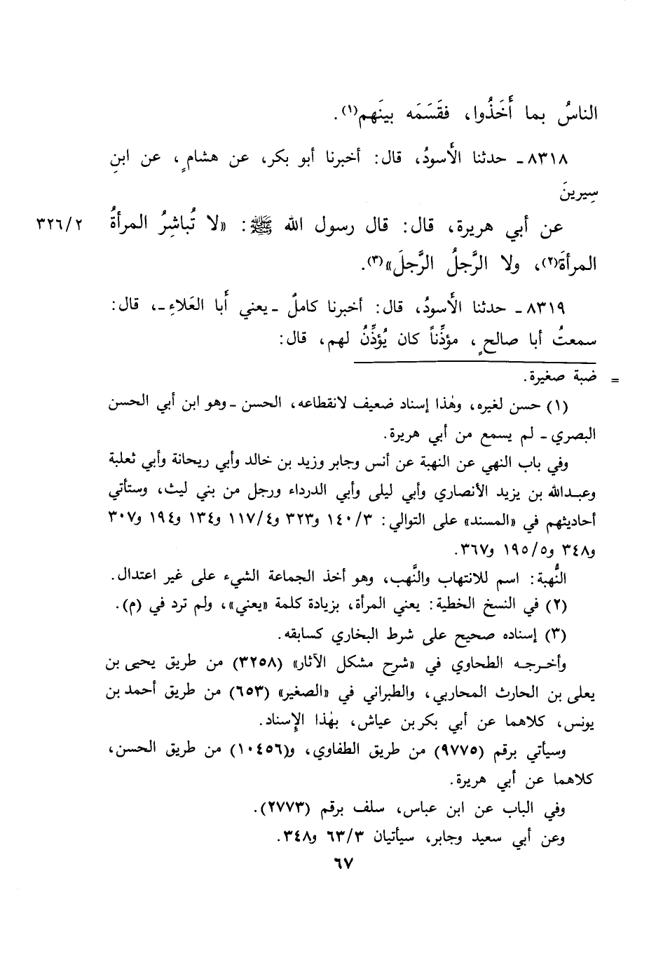 ٨٣١٨ - حَدَّثَنَا الْأَسْوَدُ، قَالَ: أَخْبَرَنَا أَبُو بَكْرٍ، عَنْ هِشَامٍ، عَنِ ابْنِ سِيرِينَ، عَنْ أَبِي هُرَيْرَةَ، قَالَ: قَالَ رَسُولُ اللهِ صَلَّى اللهُ عَلَيْهِ وَسَلَّمَ: " لَا تُبَاشِرِ الْمَرْأَةُ الْمَرْأَةَ (٢) ، وَلَا الرَّجُلُ الرَّجُلَ " (٣)