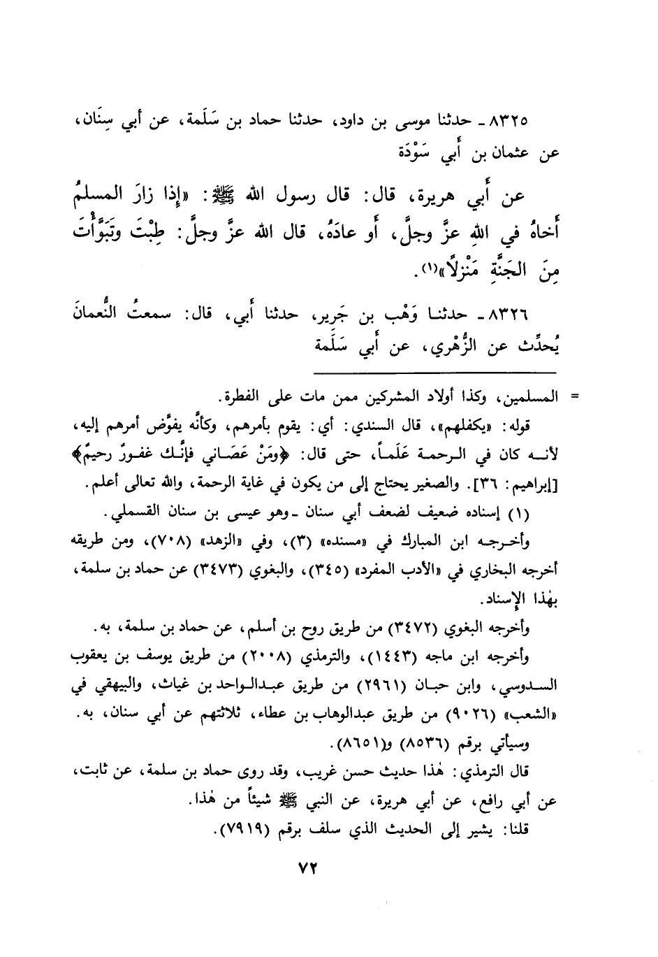 ٨٣٢٥ - حَدَّثَنَا مُوسَى بْنُ دَاوُدَ، حَدَّثَنَا حَمَّادُ بْنُ سَلَمَةَ، عَنْ أَبِي سِنَانٍ، عَنْ عُثْمَانَ بْنِ أَبِي سَوْدَةَ، عَنْ أَبِي هُرَيْرَةَ، قَالَ: قَالَ رَسُولُ اللهِ صَلَّى اللهُ عَلَيْهِ وَسَلَّمَ: " إِذَا زَارَ الْمُسْلِمُ أَخَاهُ فِي اللهِ عَزَّ وَجَلَّ، أَوْ عَادَهُ، قَالَ اللهُ عَزَّ وَجَلَّ: طِبْتَ، وَتَبَوَّأْتَ مِنَ الْجَنَّةِ مَنْزِلًا " (١)