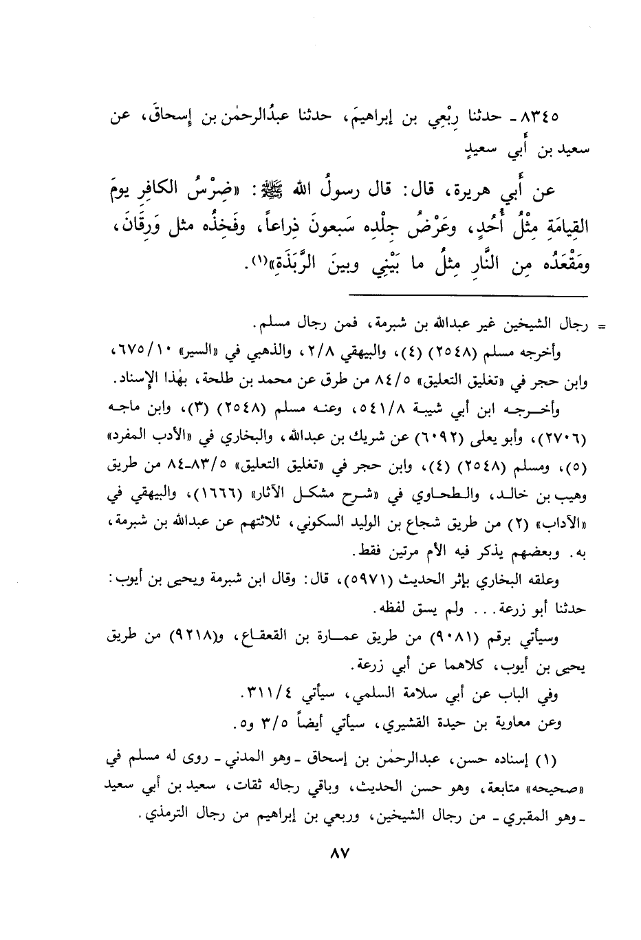 ٨٣٤٥ - حَدَّثَنَا رِبْعِيُّ بْنُ إِبْرَاهِيمَ، حَدَّثَنَا عَبْدُ الرَّحْمَنِ بْنُ إِسْحَاقَ، عَنْ سَعِيدِ بْنِ أَبِي سَعِيدٍ، عَنْ أَبِي هُرَيْرَةَ، قَالَ: قَالَ رَسُولُ اللهِ صَلَّى اللهُ عَلَيْهِ وَسَلَّمَ: " ضِرْسُ الْكَافِرِ يَوْمَ الْقِيَامَةِ مِثْلُ أُحُدٍ، وَعَرْضُ جِلْدِهِ سَبْعُونَ ذِرَاعًا، وَفَخِذُهُ مِثْلُ وَرِقَانَ، وَمَقْعَدُهُ مِنَ النَّارِ مِثْلُ مَا بَيْنِي وَبَيْنَ الرَّبَذَةِ " (١)
