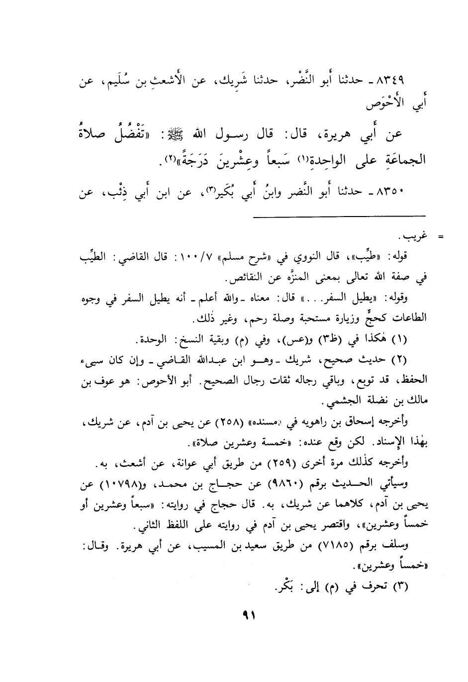 ٨٣٤٩ - حَدَّثَنَا أَبُو النَّضْرِ، حَدَّثَنَا شَرِيكٌ، عَنِ الْأَشْعَثِ بْنِ سُلَيْمٍ، عَنْ أَبِي الْأَحْوَصِ، عَنْ أَبِي هُرَيْرَةَ، قَالَ: قَالَ رَسُولُ اللهِ صَلَّى اللهُ عَلَيْهِ وَسَلَّمَ: " تَفْضُلُ صَلَاةُ الْجَمَاعَةِ عَلَى الْوَاحِدَةِ (١) سَبْعًا وَعِشْرِينَ دَرَجَةً " (٢)