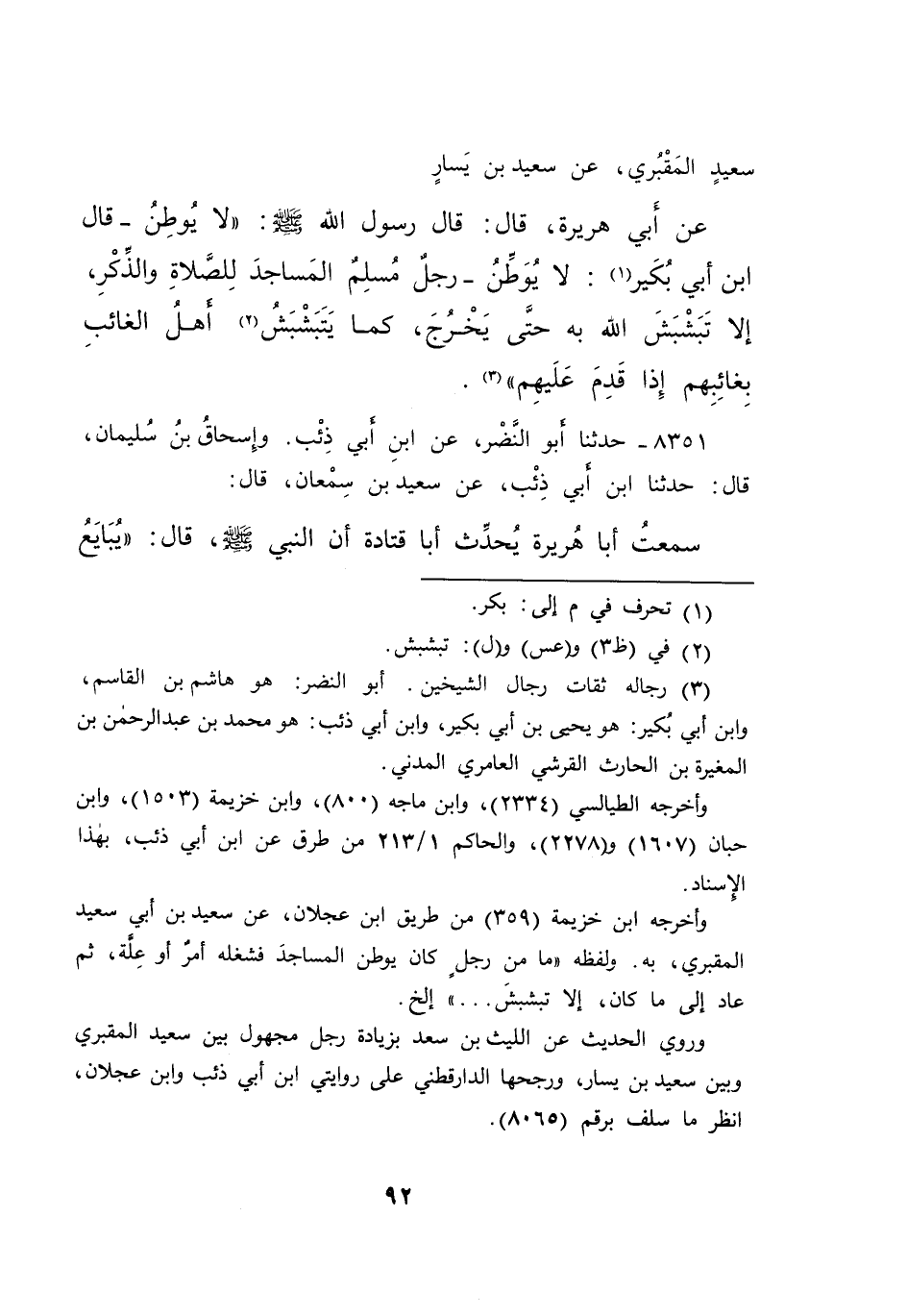 سَعِيدٍ الْمَقْبُرِيِّ، عَنْ سَعِيدِ بْنِ يَسَارٍ، عَنْ أَبِي هُرَيْرَةَ، قَالَ: قَالَ رَسُولُ اللهِ صَلَّى اللهُ عَلَيْهِ وَسَلَّمَ: " لَا يُوَطِّنُ - قَالَ ابْنُ أَبِي بُكَيْرٍ (١) : لَا يُوَطِّنُ - رَجُلٌ مُسْلِمٌ الْمَسَاجِدَ لِلصَّلَاةِ وَالذِّكْرِ، إِلَّا تَبَشْبَشَ اللهُ بِهِ حَتَّى يَخْرُجَ، كَمَا يَتَبَشْبَشُ (٢) أَهْلُ الْغَائِبِ بِغَائِبِهِمْ، إِذَا قَدِمَ عَلَيْهِمْ " (٣)
