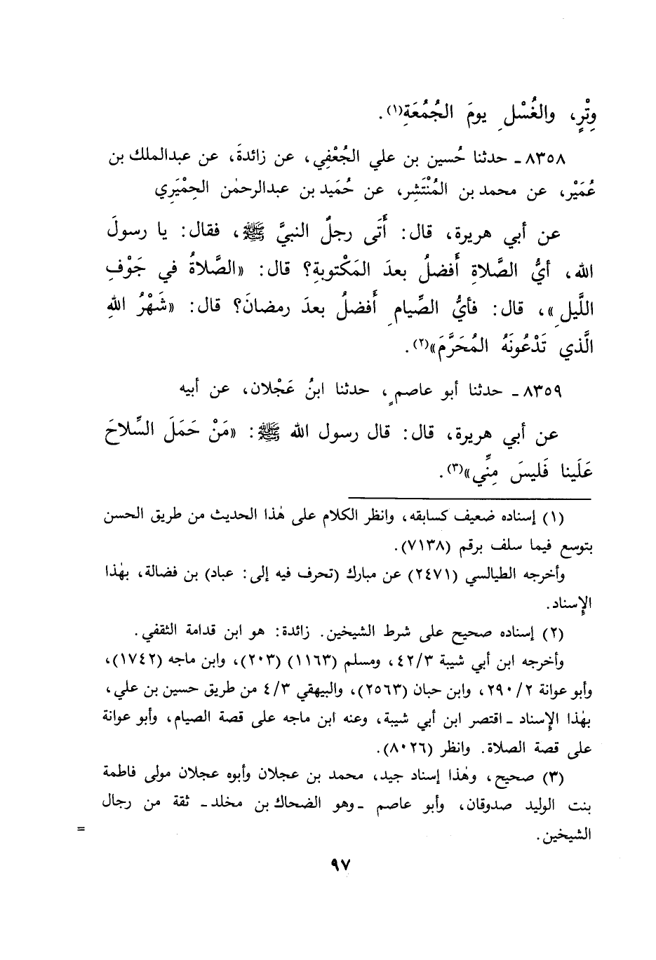 ٨٣٥٨ - حَدَّثَنَا الْحُسَيْنُ بْنُ عَلِيٍّ الْجُعْفِيُّ، عَنْ زَائِدَةَ، عَنْ عَبْدِ الْمَلِكِ بْنِ عُمَيْرٍ، عَنْ مُحَمَّدِ بْنِ الْمُنْتَشِرِ، عَنْ حُمَيْدِ بْنِ عَبْدِ الرَّحْمَنِ الْحِمْيَرِيِّ، عَنْ أَبِي هُرَيْرَةَ، قَالَ: أَتَى رَجُلٌ النَّبِيَّ صَلَّى اللهُ عَلَيْهِ وَسَلَّمَ، فَقَالَ: يَا رَسُولَ اللهِ، أَيُّ الصَّلَاةِ أَفْضَلُ بَعْدَ الْمَكْتُوبَةِ؟ قَالَ: " الصَّلَاةُ فِي جَوْفِ اللَّيْلِ " (٢)