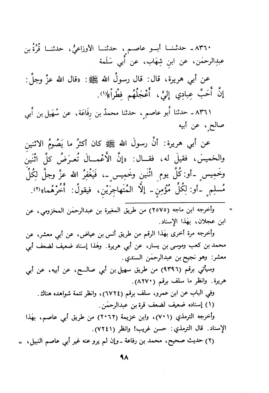 ٨٣٦١ - حَدَّثَنَا أَبُو عَاصِمٍ، حَدَّثَنَا مُحَمَّدُ بْنُ رِفَاعَةَ، عَنْ سُهَيْلِ بْنِ أَبِي صَالِحٍ، عَنْ أَبِيهِ، عَنْ أَبِي هُرَيْرَةَ، أَنَّ رَسُولَ اللهِ صَلَّى اللهُ عَلَيْهِ وَسَلَّمَ كَانَ أَكْثَرَ مَا يَصُومُ الِاثْنَيْنِ وَالْخَمِيسَ، فَقِيلَ لَهُ، فَقَالَ: " إِنَّ الْأَعْمَالَ تُعْرَضُ كُلَّ اثْنَيْنِ وَخَمِيسٍ - أَوْ: كُلَّ يَوْمِ اثْنَيْنِ وَخَمِيسٍ - فَيَغْفِرُ اللهُ عَزَّ وَجَلَّ لِكُلِّ مُسْلِمٍ - أَوْ: لِكُلِّ مُؤْمِنٍ - إِلَّا الْمُتَهَاجِرَيْنِ، فَيَقُولُ: أَخِّرْهُمَا " (٢)