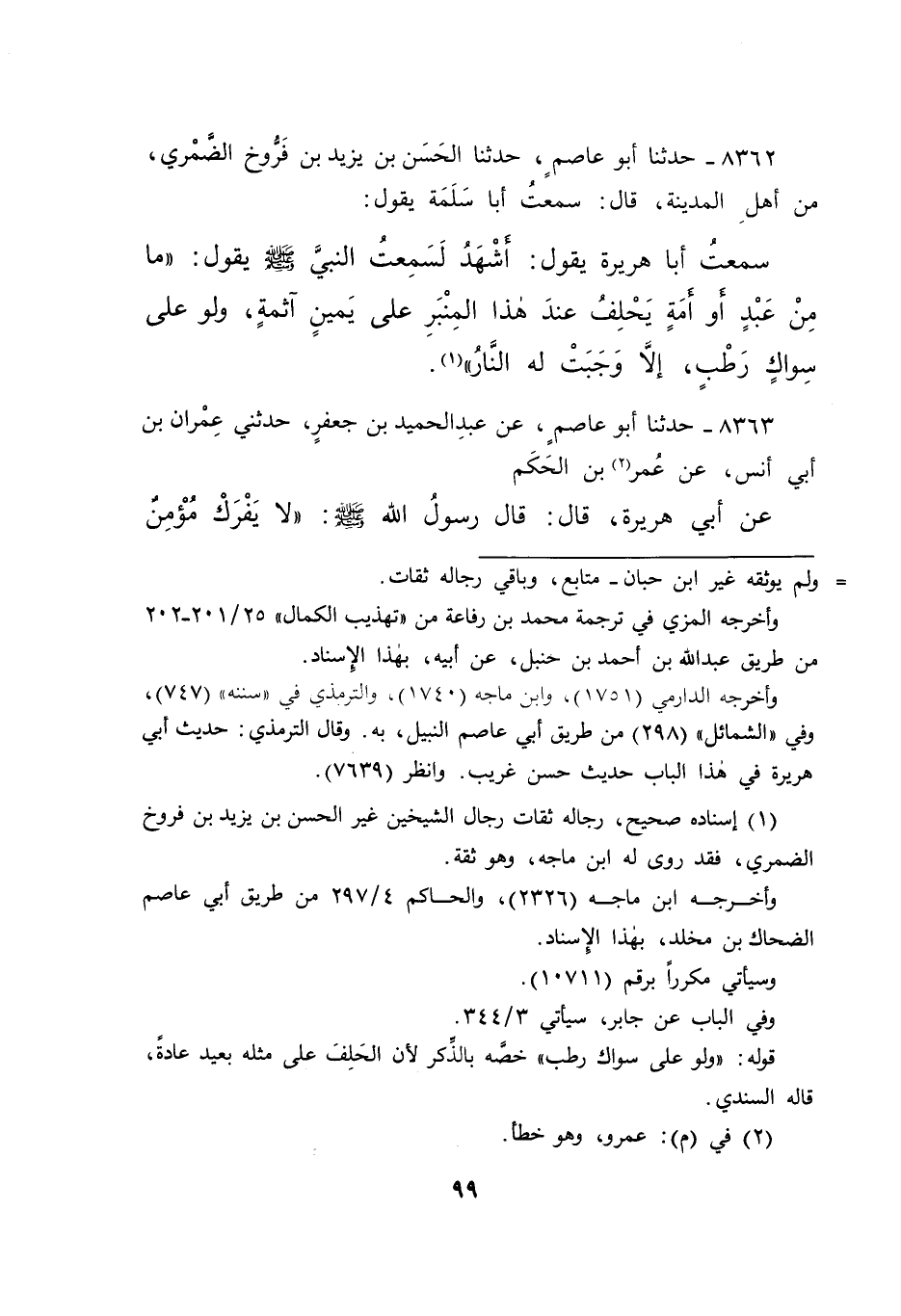 ٨٣٦٢ - حَدَّثَنَا أَبُو عَاصِمٍ، حَدَّثَنَا الْحَسَنُ بْنُ يَزِيدَ بْنِ فَرُّوخَ الضَّمْرِيُّ، مِنْ أَهْلِ الْمَدِينَةِ، قَالَ: سَمِعْتُ أَبَا سَلَمَةَ، يَقُولُ: سَمِعْتُ أَبَا هُرَيْرَةَ، يَقُولُ: أَشْهَدُ لَسَمِعْتُ النَّبِيَّ صَلَّى اللهُ عَلَيْهِ وَسَلَّمَ، يَقُولُ: " مَا مِنْ عَبْدٍ أَوْ أَمَةٍ، يَحْلِفُ عِنْدَ هَذَا الْمِنْبَرِ عَلَى يَمِينٍ آثِمَةٍ، وَلَوْ عَلَى سِوَاكٍ رَطْبٍ، إِلَّا وَجَبَتْ لَهُ النَّارُ " (١)