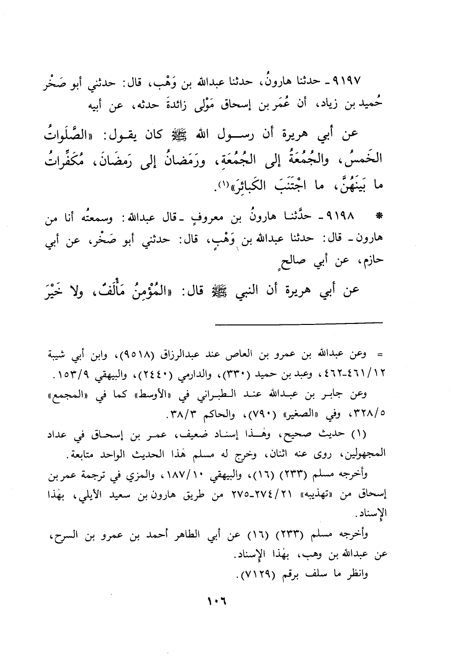 ٩١٩٧ - حَدَّثَنَا هَارُونُ، حَدَّثَنَا عَبْدُ اللهِ بْنُ وَهْبٍ، قَالَ: حَدَّثَنِي أَبُو صَخْرٍ حُمَيْدُ بْنُ زِيَادٍ، أَنَّ عُمَرَ بْنَ إِسْحَاقَ، مَوْلَى زَائِدَةَ، حَدَّثَهُ عَنْ أَبِيهِ، عَنْ أَبِي هُرَيْرَةَ، أَنَّ رَسُولَ اللهِ صَلَّى اللهُ عَلَيْهِ وَسَلَّمَ كَانَ يَقُولُ: " الصَّلَوَاتُ الْخَمْسُ، وَالْجُمُعَةُ إِلَى الْجُمُعَةِ، وَرَمَضَانُ إِلَى رَمَضَانَ، مُكَفِّرَاتٌ مَا بَيْنَهُنَّ مَا اجْتُنِبَتِ الْكَبَائِرُ " (١)