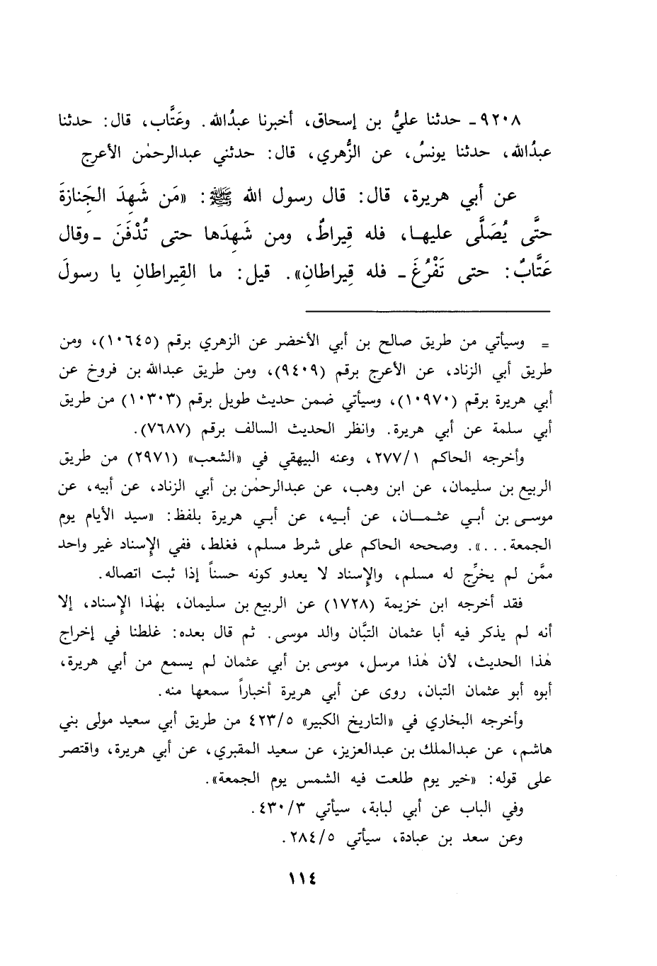 ٩٢٠٨ - حَدَّثَنَا عَلِيُّ بْنُ إِسْحَاقَ، أَخْبَرَنَا عَبْدُ اللهِ، وَعَتَّابٌ، قَالَ: حَدَّثَنَا عَبْدُ اللهِ، حَدَّثَنَا يُونُسُ، عَنِ الزُّهْرِيِّ، قَالَ: حَدَّثَنِي عَبْدُ الرَّحْمَنِ الْأَعْرَجُ، عَنْ أَبِي هُرَيْرَةَ، قَالَ: قَالَ رَسُولُ اللهِ صَلَّى اللهُ عَلَيْهِ وَسَلَّمَ: " مَنْ شَهِدَ الْجِنَازَةَ حَتَّى يُصَلَّى عَلَيْهَا فَلَهُ قِيرَاطٌ، وَمَنْ شَهِدَهَا حَتَّى تُدْفَنَ - وَقَالَ عَتَّابٌ: حَتَّى تُفْرَغَ - فَلَهُ قِيرَاطَانِ "، قِيلَ: وَمَا الْقِيرَاطَانِ يَا رَسُولَ