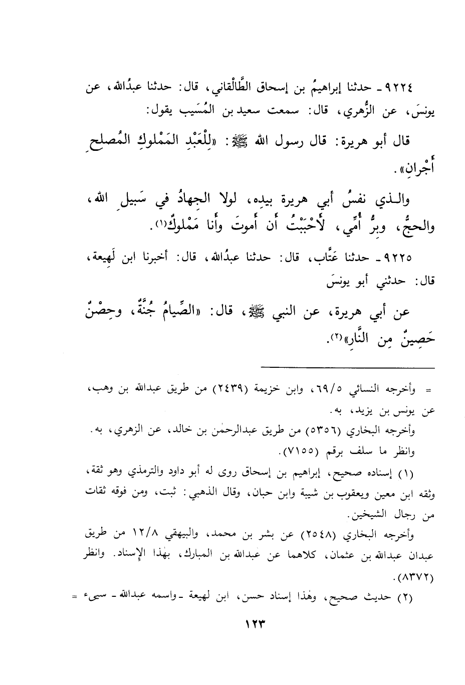 ٩٢٢٤ - حَدَّثَنَا إِبْرَاهِيمُ بْنُ إِسْحَاقَ الطَّالْقَانِيُّ، قَالَ: حَدَّثَنَا عَبْدُ اللهِ، عَنْ يُونُسَ، عَنِ الزُّهْرِيِّ، قَالَ: سَمِعْتُ سَعِيدَ بْنَ الْمُسَيِّبِ، يَقُولُ: قَالَ أَبُو هُرَيْرَةَ: قَالَ رَسُولُ اللهِ صَلَّى اللهُ عَلَيْهِ وَسَلَّمَ: " لِلْعَبْدِ الْمَمْلُوكِ الْمُصْلِحِ أَجْرَانِ "، " وَالَّذِي نَفْسُ أَبِي هُرَيْرَةَ بِيَدِهِ، لَوْلَا الْجِهَادُ فِي سَبِيلِ اللهِ، وَالْحَجُّ، وَبِرُّ أُمِّي لَأَحْبَبْتُ أَنْ أَمُوتَ وَأَنَا مَمْلُوكٌ " (١)