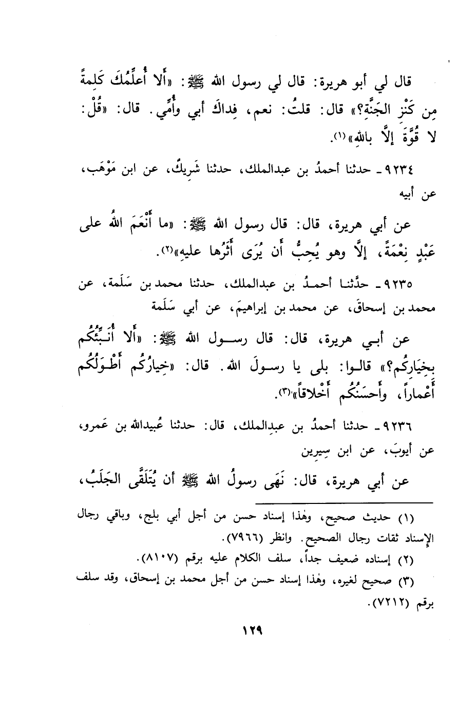 قَالَ لِي أَبُو هُرَيْرَةَ: قَالَ لِي رَسُولُ اللهِ صَلَّى اللهُ عَلَيْهِ وَسَلَّمَ: " أَلَا أُعَلِّمُكَ كَلِمَةً مِنْ كَنْزِ الْجَنَّةِ؟ قَالَ: قُلْتُ: نَعَمْ، فِدَاكَ أَبِي وَأُمِّي، قَالَ: " قُلْ: لَا قُوَّةَ إِلَّا بِاللهِ " (١)