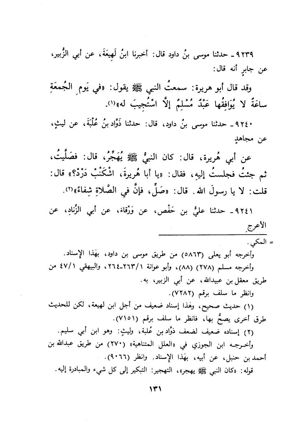 ٩٢٤٠ - حَدَّثَنَا مُوسَى بْنُ دَاوُدَ، قَالَ: حَدَّثَنَا ذَوَّادُ بْنُ عُلْبَةَ، عَنْ لَيْثٍ، عَنْ مُجَاهِدٍ، عَنْ أَبِي هُرَيْرَةَ، قَالَ: كَانَ النَّبِيُّ صَلَّى اللهُ عَلَيْهِ وَسَلَّمَ يُهَجِّرُ، قَالَ: فَصَلَّيْتُ، ثُمَّ جِئْتُ فَجَلَسْتُ إِلَيْهِ، فَقَالَ: يَا أَبَا هُرَيْرَةَ: " اشكمت درد؟ "، قَالَ: قُلْتُ: لَا، يَا رَسُولَ اللهِ، قَالَ: " صَلِّ، فَإِنَّ فِي الصَّلَاةِ شِفَاءً " (٢)