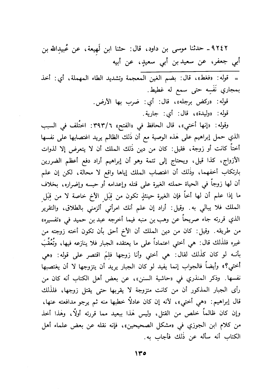 وقوله: "إنها أختي"، قال الحافظ في "الفتح" ٦/٣٩٣: اختُلف في السبب الذي حمل إبراهيم على هذه الوصية مع أن ذلك الظالم يريد اغتصابها على نفسها أختاً كانت أو زوجة، فقيل: كان من دين ذلك الملك أن لا يتعرض إلا لذوات الأزواج، كذا قيل، ويحتاج إلى تتمة وهو أن إبراهيم أراد دفع أعظم الضررين بارتكاب أخفهما، وذلك أن اغتصاب الملك إياها واقع لا محالة، لكن إن علم أن لها زوجاً في الحياة حملته الغيرة على قتله وإعدامه أو حبسه وإضراره، بخلاف ما إذا علم أن لها أخاً فإن الغيرة حينئذٍ تكون من قِبَلِ الأخ خاصة لا من قِبَلِ الملك فلا يبالي به. وقيل: أراد إن علم أنك امرأتي ألزمني بالطلاق، والتقرير الذي قررته جاء صريحاً عن وهب بن منبه فيما أخرجه عبد بن حميد في "تفسيره" من طريقه. وقيل: كان من دين الملك أن الأخ أحق بأن تكون أخته زوجته من غيره فلذلك قال: هي أختي اعتماداً على ما يعتقده الجبار فلا ينازعه فيها، وتُعُقبَ بأنه لو كان كذلك لقال: هي أختي وأنا زوجها فلِمَ اقتصر على قوله: "هي أختي؟ " وأيضا فالجواب إنما يفيد لو كان الجبار يريد أن يتزوجها لا أن يغتصبها نفسها. وذكر المنذري في "حاشية السنن"، عن بعض أهل الكتاب أنه كان من رأى الجبار المذكور أن من كانت متزوجة لا يقربها حتى يقتل زوجها، فلذلك قال إبراهيم: "هي أختي"، لأنه إن كان عادلا خطبها منه ثم يرجو مدافعته عنها، وإن كان ظالماً خلص من القتل، وليس هذا ببعيد مما قررته أولا، وهذا أخذ من كلام ابن الجوزي في "مشكل الصحيحين"، فإنه نقله عن بعض علماء أهل الكتاب أنه سأله عن ذلك فأجاب به.