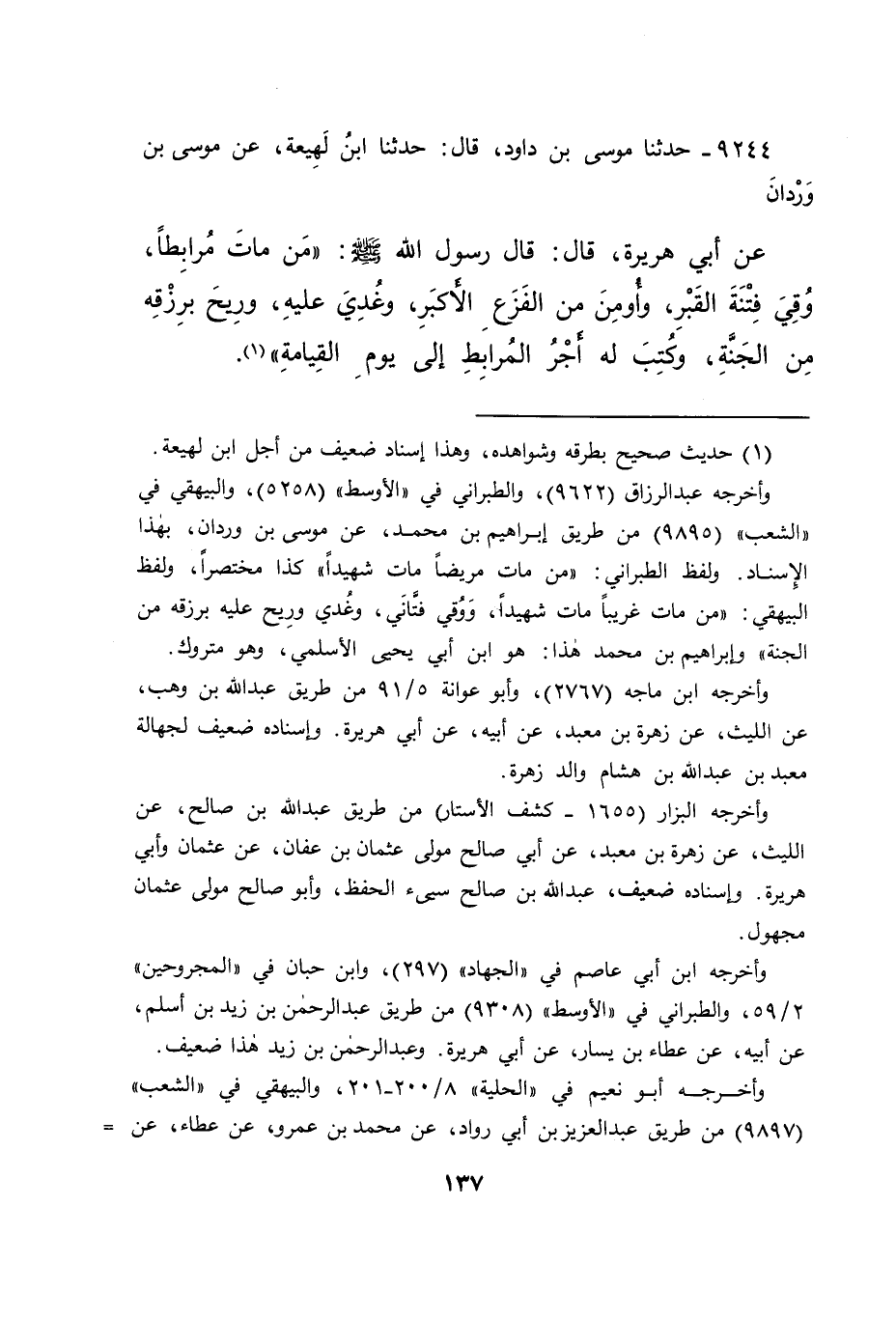 ٩٢٤٤ - حَدَّثَنَا مُوسَى بْنُ دَاوُدَ، قَالَ: حَدَّثَنَا ابْنُ لَهِيعَةَ، عَنْ مُوسَى بْنِ وَرْدَانَ، عَنْ أَبِي هُرَيْرَةَ، قَالَ: قَالَ رَسُولُ اللهِ صَلَّى اللهُ عَلَيْهِ وَسَلَّمَ: " مَنْ مَاتَ مُرَابِطًا، وُقِيَ فِتْنَةَ الْقَبْرِ، وَأُومِنَ مِنَ الْفَزَعِ الْأَكْبَرِ، وَغُدِيَ عَلَيْهِ، وَرِيحَ بِرِزْقِهِ مِنَ الْجَنَّةِ، وَكُتِبَ لَهُ أَجْرُ الْمُرَابِطِ إِلَى يَوْمِ الْقِيَامَةِ " (١)