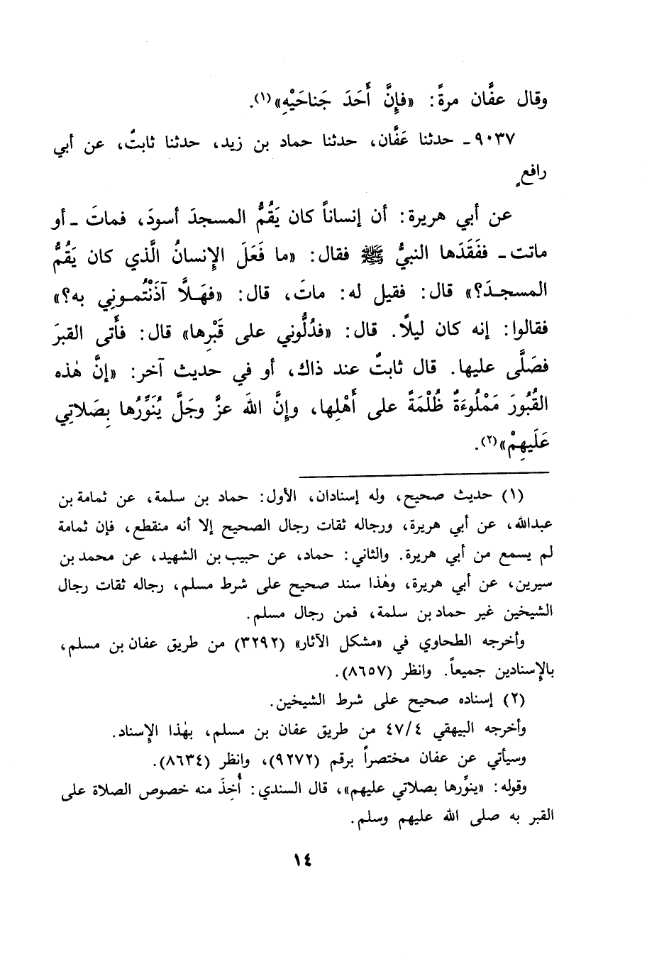 ٩٠٣٧ - حَدَّثَنَا عَفَّانُ، حَدَّثَنَا حَمَّادُ بْنُ زَيْدٍ، حَدَّثَنَا ثَابِتٌ، عَنْ أَبِي رَافِعٍ، عَنْ أَبِي هُرَيْرَةَ، أَنَّ إِنْسَانًا كَانَ يَقُمُّ الْمَسْجِدَ أَسْوَدَ فمَاتَ - أَوْ مَاتَتْ - فَفَقَدَهَا النَّبِيُّ صَلَّى اللهُ عَلَيْهِ وَسَلَّمَ، فَقَالَ: " مَا فَعَلَ الْإِنْسَانُ الَّذِي كَانَ يَقُمُّ الْمَسْجِدَ؟ "، قَالَ: فَقِيلَ لَهُ: مَاتَ، قَالَ: " فَهَلَّا آذَنْتُمُونِي بِهِ؟ " فَقَالُوا: إِنَّهُ كَانَ لَيْلًا، قَالَ: " فَدُلُّونِي عَلَى قَبْرِهَا "، قَالَ: فَأَتَى الْقَبْرَ، فَصَلَّى عَلَيْهَا