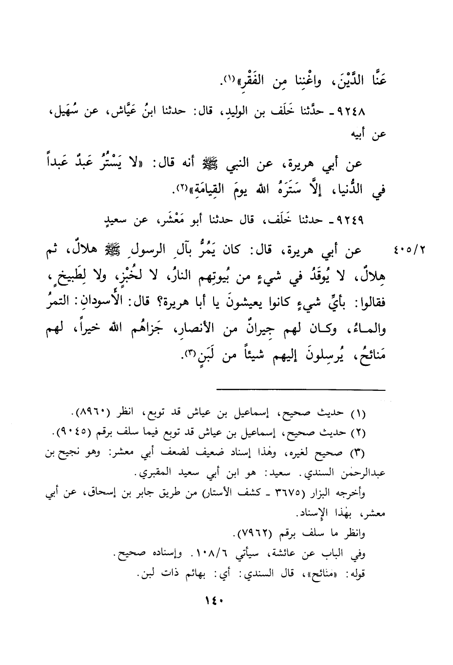 ٩٢٤٩ - حَدَّثَنَا خَلَفٌ، قَالَ: حَدَّثَنَا أَبُو مَعْشَرٍ، عَنْ سَعِيدٍ، عَنْ أَبِي هُرَيْرَةَ، " قال: " كَانَ يَمُرُّ بِآلِ النَّبِيِّ صَلَّى اللهُ عَلَيْهِ وَسَلَّمَ هِلَالٌ، ثُمَّ هِلَالٌ، لَا يُوقَدُ فِي شَيْءٍ مِنْ بُيُوتِهِمُ النَّارُ، لَا لِخُبْزٍ، وَلَا لِطَبِيخٍ "، فَقَالُوا: بِأَيِّ شَيْءٍ كَانُوا يَعِيشُونَ يَا أَبَا هُرَيْرَةَ؟ قَالَ: " بِالْأَسْوَدَيْنِ: التَّمْرِ وَالْمَاءِ، وَكَانَ لَهُمْ جِيرَانٌ مِنَ الْأَنْصَارِ، وَجَزَاهُمُ اللهُ خَيْرًا، لَهُمْ مَنَائِحُ يُرْسِلُونَ إِلَيْهِمْ شَيْئًا مِنْ لَبَنٍ " (٣)