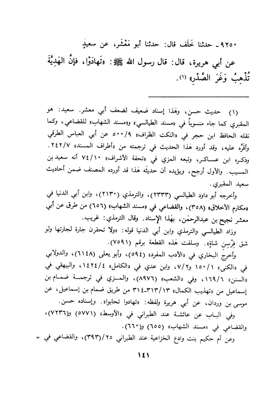 ٩٢٥٠ - حَدَّثَنَا خَلَفٌ، قَالَ: حَدَّثَنَا أَبُو مَعْشَرٍ، عَنْ سَعِيدٍ، عَنْ أَبِي هُرَيْرَةَ، قَالَ: قَالَ رَسُولُ اللهِ صَلَّى اللهُ عَلَيْهِ وَسَلَّمَ: " تَهَادَوْا، فَإِنَّ الْهَدِيَّةَ تُذْهِبُ وَغَرَ الصَّدْرِ " (١)