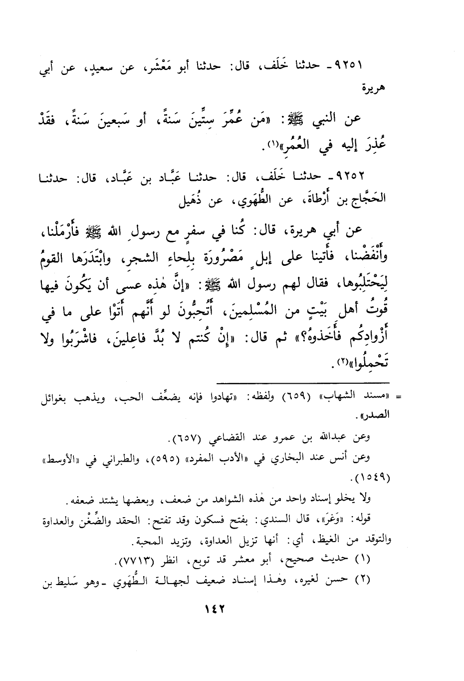 ٩٢٥١ - حَدَّثَنَا خَلَفٌ، قَالَ: حَدَّثَنَا أَبُو مَعْشَرٍ، عَنْ سَعِيدٍ، عَنْ أَبِي هُرَيْرَةَ، عَنِ النَّبِيِّ صَلَّى اللهُ عَلَيْهِ وَسَلَّمَ: " مَنْ عُمِّرَ سِتِّينَ سَنَةً، أَوْ سَبْعِينَ سَنَةً، فَقَدْ عُذِرَ إِلَيْهِ فِي الْعُمُرِ " (١)