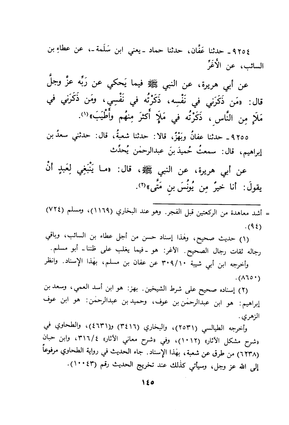 ٩٢٥٥ - حَدَّثَنَا عَفَّانُ، وَبَهْزٌ، قَالَا: حَدَّثَنَا شُعْبَةُ، قَالَ: حَدَّثَنِي سَعْدُ بْنُ إِبْرَاهِيمَ، قَالَ: سَمِعْتُ حُمَيْدَ بْنَ عَبْدِ الرَّحْمَنِ، يُحَدِّثُ عَنْ أَبِي هُرَيْرَةَ، عَنِ النَّبِيِّ صَلَّى اللهُ عَلَيْهِ وَسَلَّمَ قَالَ: " مَا يَنْبَغِي لِعَبْدٍ أَنْ يَقُولَ: أَنَا خَيْرٌ مِنْ يُونُسَ بْنِ مَتَّى " (٢)