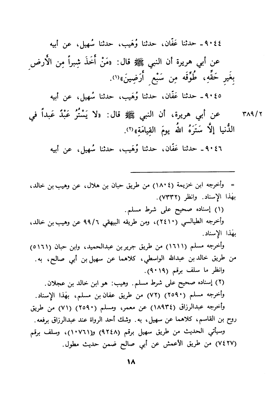٩٠٤٤ - حَدَّثَنَا عَفَّانُ، حَدَّثَنَا وُهَيْبٌ، حَدَّثَنَا سُهَيْلٌ، عَنْ أَبِيهِ، عَنْ أَبِي هُرَيْرَةَ أَنَّ النَّبِيَّ صَلَّى اللهُ عَلَيْهِ وَسَلَّمَ قَالَ: " مَنْ أَخَذَ شِبْرًا مِنَ الْأَرْضِ بِغَيْرِ حَقِّهِ، طُوِّقَهُ مِنْ سَبْعِ أَرَضِينَ " (١)