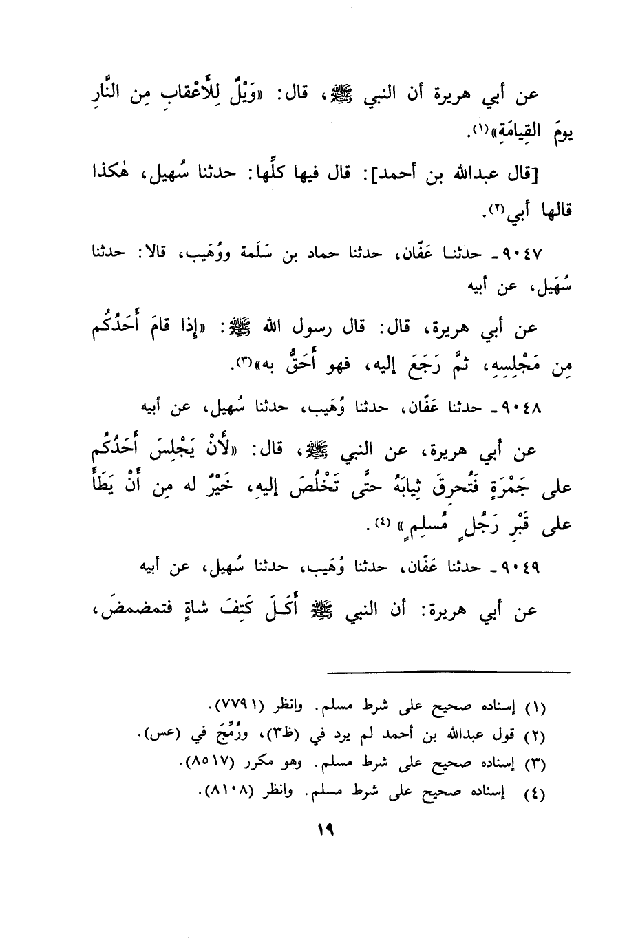 عَنْ أَبِي هُرَيْرَةَ أَنَّ النَّبِيِّ صَلَّى اللهُ عَلَيْهِ وَسَلَّمَ قَالَ: " وَيْلٌ لِلْأَعْقَابِ مِنَ النَّارِ يَوْمَ الْقِيَامَةِ " (١) ، قَالَ: عَبْدُ اللهِ بْنُ أَحْمَدَ: قَالَ: " فِيهَا كُلِّهَا حَدَّثَنَا سُهَيْلٌ " هَكَذَا قَالَهَا أَبِي (٢)