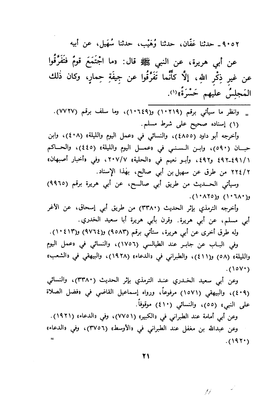 ٩٠٥٢ - حَدَّثَنَا عَفَّانُ، حَدَّثَنَا وُهَيْبٌ، حَدَّثَنَا سُهَيْلٌ، عَنْ أَبِيهِ، عَنْ أَبِي هُرَيْرَةَ عَنِ النَّبِيِّ صَلَّى اللهُ عَلَيْهِ وَسَلَّمَ قَالَ: " مَا اجْتَمَعَ قَوْمٌ فَتَفَرَّقُوا عَنْ غَيْرِ ذِكْرِ اللهِ، إِلَّا كَأَنَّمَا تَفَرَّقُوا عَنْ جِيفَةِ حِمَارٍ، وَكَانَ ذَلِكَ الْمَجْلِسُ عَلَيْهِمْ حَسْرَةً " (١)