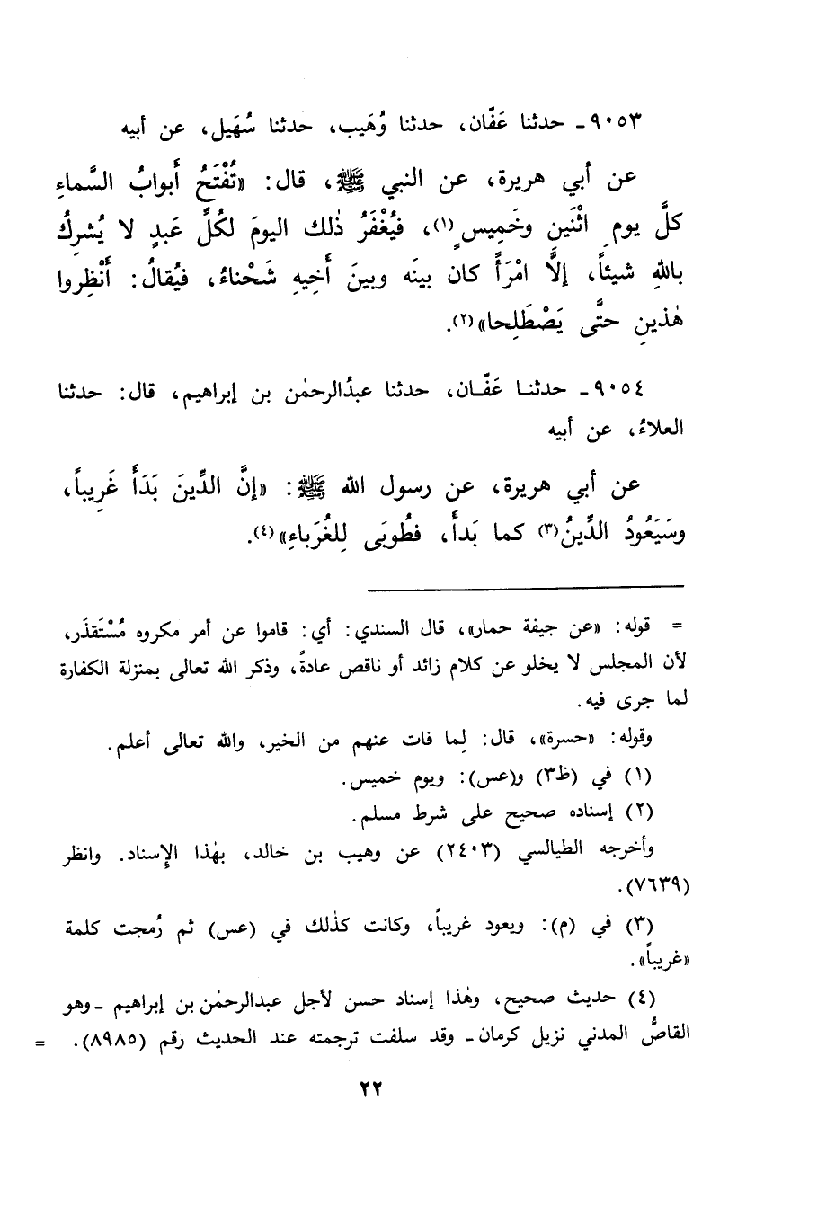 ٩٠٥٣ - حَدَّثَنَا عَفَّانُ، حَدَّثَنَا وُهَيْبٌ، حَدَّثَنَا سُهَيْلٌ، عَنْ أَبِيهِ، عَنْ أَبِي هُرَيْرَةَ، عَنِ النَّبِيِّ صَلَّى اللهُ عَلَيْهِ وَسَلَّمَ قَالَ: " تُفْتَحُ أَبْوَابُ السَّمَاءِ كُلَّ يَوْمِ اثْنَيْنِ وَخَمِيسٍ (١) ، فَيُغْفَرُ ذَلِكَ الْيَوْمَ لِكُلِّ عَبْدٍ لَا يُشْرِكُ بِاللهِ شَيْئًا، إِلَّا امْرَأً كَانَ بَيْنَهُ وَبَيْنَ أَخِيهِ شَحْنَاءُ، فَيُقَالُ: أَنْظِرُوا هَذَيْنِ حَتَّى يَصْطَلِحَا " (٢)