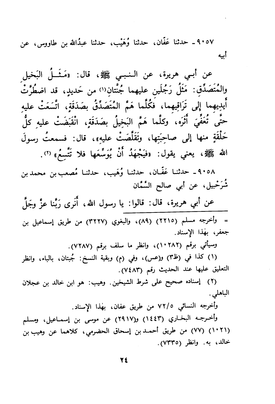 ٩٠٥٧ - حَدَّثَنَا عَفَّانُ، حَدَّثَنَا وُهَيْبٌ، حَدَّثَنَا عَبْدُ اللهِ بْنُ طَاوُسٍ، عَنْ أَبِيهِ، عَنْ أَبِي هُرَيْرَةَ، عَنِ النَّبِيِّ صَلَّى اللهُ عَلَيْهِ وَسَلَّمَ قَالَ: " مَثَلُ الْبَخِيلِ وَالْمُتَصَدِّقِ، مَثَلُ رَجُلَيْنِ عَلَيْهِمَا جُنَّتَانِ (١) مِنْ حَدِيدٍ، قَدِ اضْطُرَّتْ أَيْدِيهِمَا إِلَى تَرَاقِيهِمَا، فَكُلَّمَا هَمَّ الْمُتَصَدِّقُ بِصَدَقَةٍ، اتَّسَعَتْ عَلَيْهِ حَتَّى تُعَفِّيَ أَثَرَهُ، وَكُلَّمَا هَمَّ الْبَخِيلُ بِصَدَقَةٍ، انْقَبَضَتْ عَلَيْهِ كُلُّ حَلْقَةٍ مِنْهَا إِلَى صَاحِبَتِهَا، وَتَقَلَّصَتْ عَلَيْهِ "، قَالَ: فَسَمِعْتُ رَسُولَ اللهِ صَلَّى اللهُ عَلَيْهِ وَسَلَّمَ يَعْنِي يَقُولُ: " فَيَجْهَدُ أَنْ يُوَسِّعَهَا فَلَا تَتَّسِعُ " (٢)