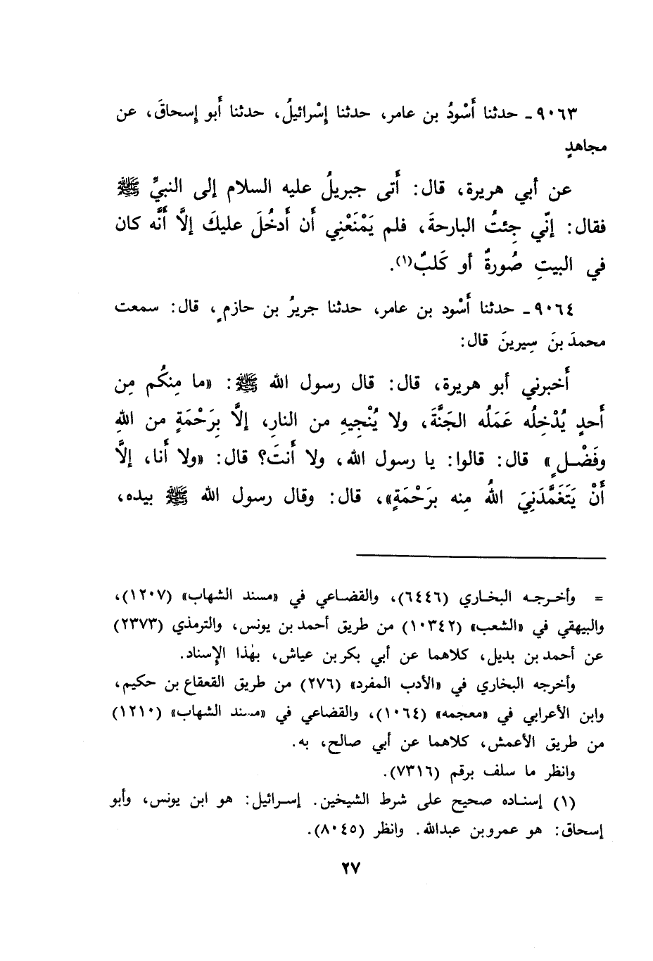 ٩٠٦٤ - حَدَّثَنَا أَسْوَدُ بْنُ عَامِرٍ، حَدَّثَنَا جَرِيرُ بْنُ حَازِمٍ، قَالَ: سَمِعْتُ مُحَمَّدَ بْنَ سِيرِينَ، قَالَ: أَخْبَرَنِي أَبُو هُرَيْرَةَ، قَالَ: قَالَ رَسُولُ اللهِ صَلَّى اللهُ عَلَيْهِ وَسَلَّمَ " مَا مِنْكُمْ مِنْ أَحَدٍ يُدْخِلُهُ عَمَلُهُ الْجَنَّةَ، وَلَا يُنَجِّيهِ مِنَ النَّارِ، إِلَّا بِرَحْمَةٍ مِنَ اللهِ وَفَضْلٍ "، قَالَ: قَالُوا: يَا رَسُولَ اللهِ، وَلَا أَنْتَ؟ قَالَ: " وَلَا أَنَا، إِلَّا أَنْ يَتَغَمَّدَنِي اللهُ مِنْهُ بِرَحْمَةٍ "، قَالَ: وَقَالَ رَسُولُ اللهِ صَلَّى اللهُ عَلَيْهِ وَسَلَّمَ بِيَدِهِ،