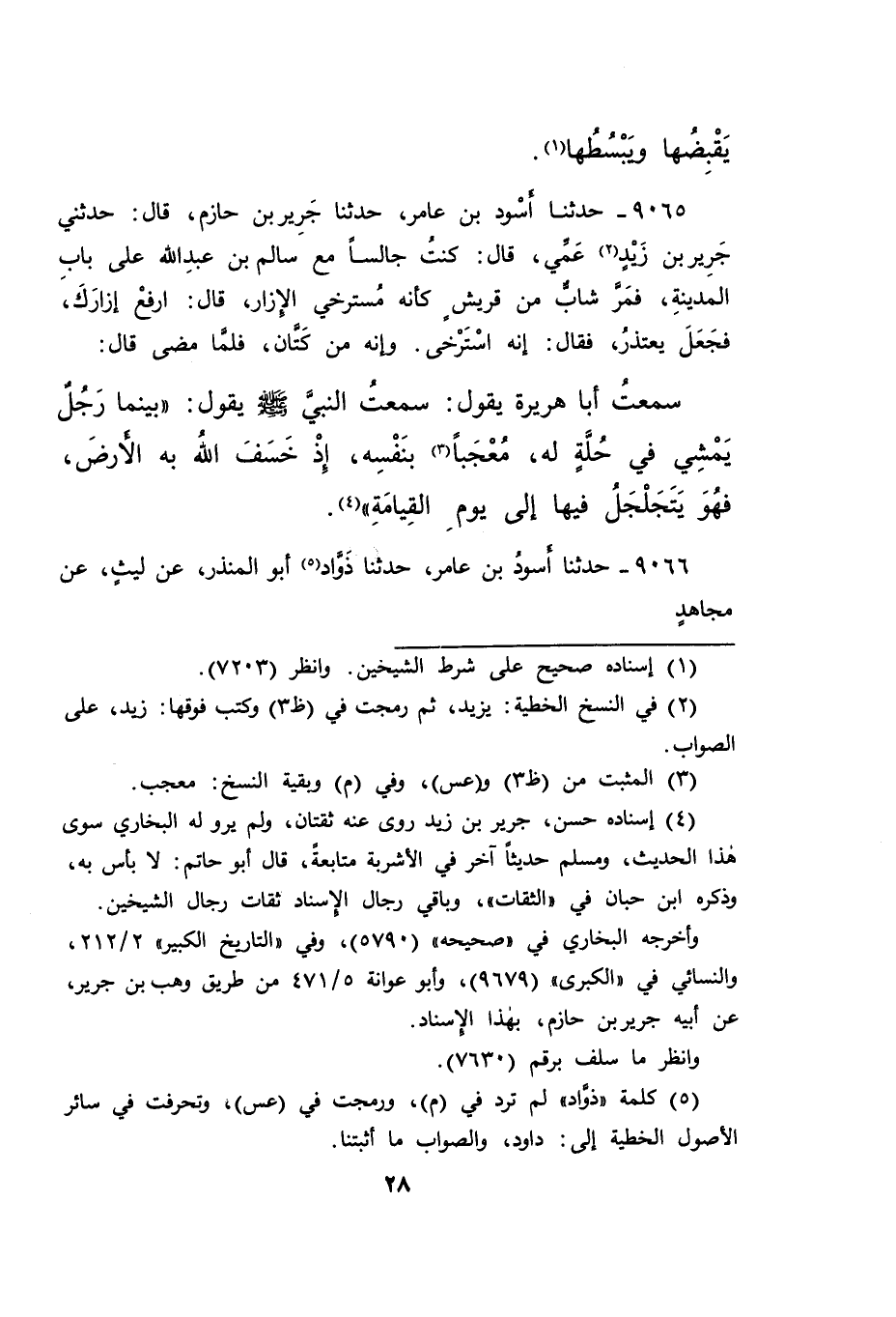 ٩٠٦٥ - حَدَّثَنَا أَسْوَدُ بْنُ عَامِرٍ، حَدَّثَنَا جَرِيرُ بْنُ حَازِمٍ، قَالَ: حَدَّثَنِي جَرِيرُ بْنُ زَيْدٍ (٢) عَمِّي، قَالَ: كُنْتُ جَالِسًا مَعَ سَالِمِ بْنِ عَبْدِ اللهِ عَلَى بَابِ الْمَدِينَةِ، فَمَرَّ شَابٌّ مِنْ قُرَيْشٍ كَأَنَّهُ مُسْتَرْخِي الْإِزَارِ، قَالَ: ارْفَعْ إِزَارَكَ، فَجَعَلَ يَعْتَذِرُ، فَقَالَ: إِنَّهُ اسْتَرْخَى، وَإِنَّهُ مِنْ كَتَّانٍ، فَلَمَّا مَضَى، قَالَ: سَمِعْتُ أَبَا هُرَيْرَةَ، يَقُولُ: سَمِعْتُ النَّبِيَّ صَلَّى اللهُ عَلَيْهِ وَسَلَّمَ يَقُولُ: " بَيْنَمَا رَجُلٌ يَمْشِي فِي حُلَّةٍ لَهُ، مُعْجَبًا (٣) بِنَفْسِهِ، إِذْ خَسَفَ اللهُ بِهِ الْأَرْضَ، فَهُوَ يَتَجَلْجَلُ فِيهَا إِلَى يَوْمِ الْقِيَامَةِ " (٤)