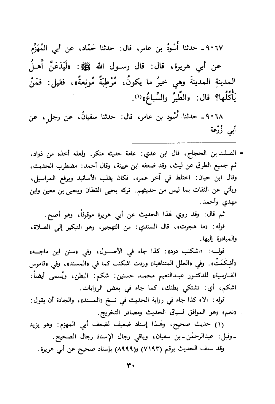 ٩٠٦٧ - حَدَّثَنَا أَسْوَدُ بْنُ عَامِرٍ، قَالَ: حَدَّثَنَا حَمَّادٌ، عَنْ أَبِي الْمُهَزِّمِ، عَنْ أَبِي هُرَيْرَةَ، قَالَ: قَالَ رَسُولُ اللهِ صَلَّى اللهُ عَلَيْهِ وَسَلَّمَ: " لَيَدَعَنَّ أَهْلُ الْمَدِينَةِ الْمَدِينَةَ، وَهِيَ خَيْرُ مَا يَكُونُ، مُرْطِبَةٌ مُونِعَةٌ "، فَقِيلَ: فَمَنْ يَأْكُلُهَا؟ قَالَ: " الطَّيْرُ وَالسِّبَاعُ " (١)