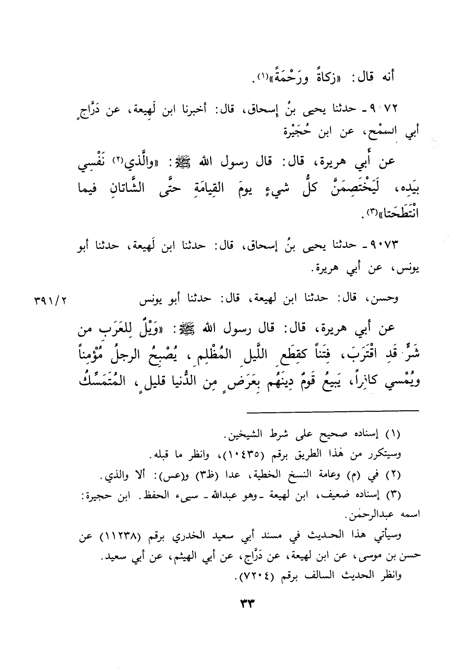 ٩٠٧٢ - حَدَّثَنَا يَحْيَى بْنُ إِسْحَاقَ، قَالَ: أَخْبَرَنَا ابْنُ لَهِيعَةَ، عَنْ دَرَّاجٍ أَبِي السَّمْحِ، عَنْ ابْنِ حُجَيْرَةَ، عَنْ أَبِي هُرَيْرَةَ، قَالَ: قَالَ رَسُولُ اللهِ صَلَّى اللهُ عَلَيْهِ وَسَلَّمَ: " وَالَّذِي (٢) نَفْسِي بِيَدِهِ، لَيَخْتَصِمَنَّ كُلُّ شَيْءٍ يَوْمَ الْقِيَامَةِ، حَتَّى الشَّاتَانِ فِيمَا انْتَطَحَتَا " (٣)
