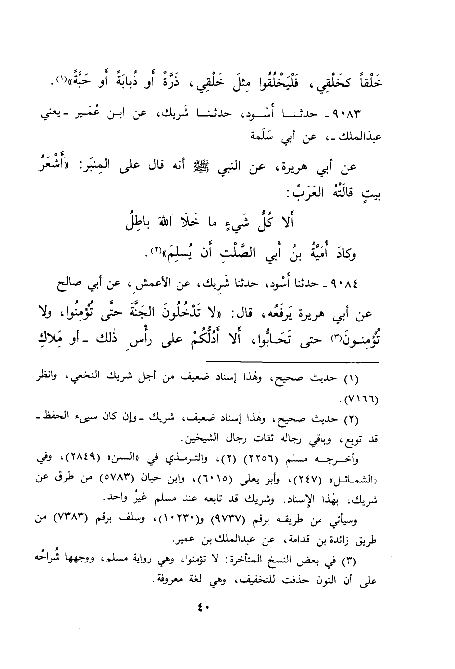 ٩٠٨٣ - حَدَّثَنَا أَسْوَدُ، حَدَّثَنَا شَرِيكٌ، عَنْ ابْنِ عُمَيْرٍ يَعْنِي عَبْدَ الْمَلِكِ، عَنْ أَبِي سَلَمَةَ، عَنْ أَبِي هُرَيْرَةَ، عَنِ النَّبِيِّ صَلَّى اللهُ عَلَيْهِ وَسَلَّمَ، أَنَّهُ قَالَ عَلَى الْمِنْبَرِ: " أَشْعَرُ بَيْتٍ قَالَتْهُ الْعَرَبُ: