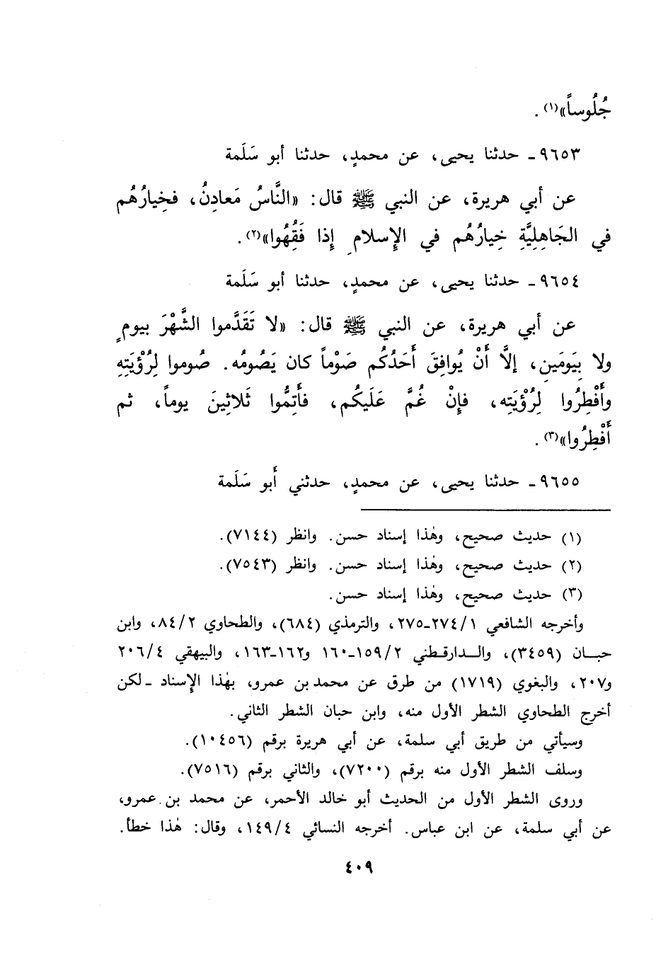 ٩٦٥٤ - حَدَّثَنَا يَحْيَى، عَنْ مُحَمَّدٍ، حَدَّثَنَا أَبُو سَلَمَةَ، عَنْ أَبِي هُرَيْرَةَ، عَنِ النَّبِيِّ صَلَّى اللهُ عَلَيْهِ وَسَلَّمَ: قَالَ: " لَا تَقَدَّمُوا الشَّهْرَ بِيَوْمٍ وَلَا بيَوْمَيْنِ، إِلَّا أَنْ يُوَافِقَ أَحَدُكُمْ صَوْمًا كَانَ يَصُومُهُ، صُومُوا لِرُؤْيَتِهِ وَأَفْطِرُوا لِرُؤْيَتِهِ، فَإِنْ غُمَّ عَلَيْكُمْ فَأَتِمُّوا ثَلَاثِينَ يَوْمًا، ثُمَّ أَفْطِرُوا " (٣)