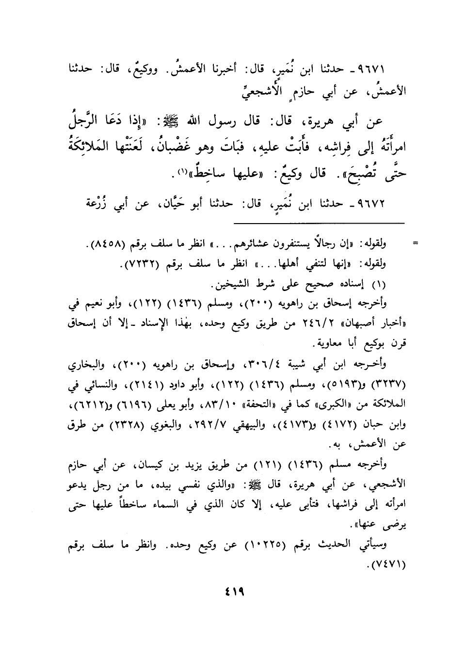 ٩٦٧١ - حَدَّثَنَا ابْنُ نُمَيْرٍ، قَالَ: أَخْبَرَنَا الْأَعْمَشُ، وَوَكِيعٌ، قَالَ: حَدَّثَنَا الْأَعْمَشُ، عَنْ أَبِي حَازِمٍ الْأَشْجَعِيِّ، عَنْ أَبِي هُرَيْرَةَ، قَالَ: قَالَ رَسُولُ اللهِ صَلَّى اللهُ عَلَيْهِ وَسَلَّمَ: " إِذَا دَعَا الرَّجُلُ امْرَأَتَهُ إِلَى فِرَاشِهِ، فَأَبَتْ عَلَيْهِ، فَبَاتَ وَهُوَ غَضْبَانُ، لَعَنَتْهَا الْمَلَائِكَةُ حَتَّى تُصْبِحَ "، قَالَ وَكِيعٌ: عَلَيْهَا سَاخِطٌ (١)