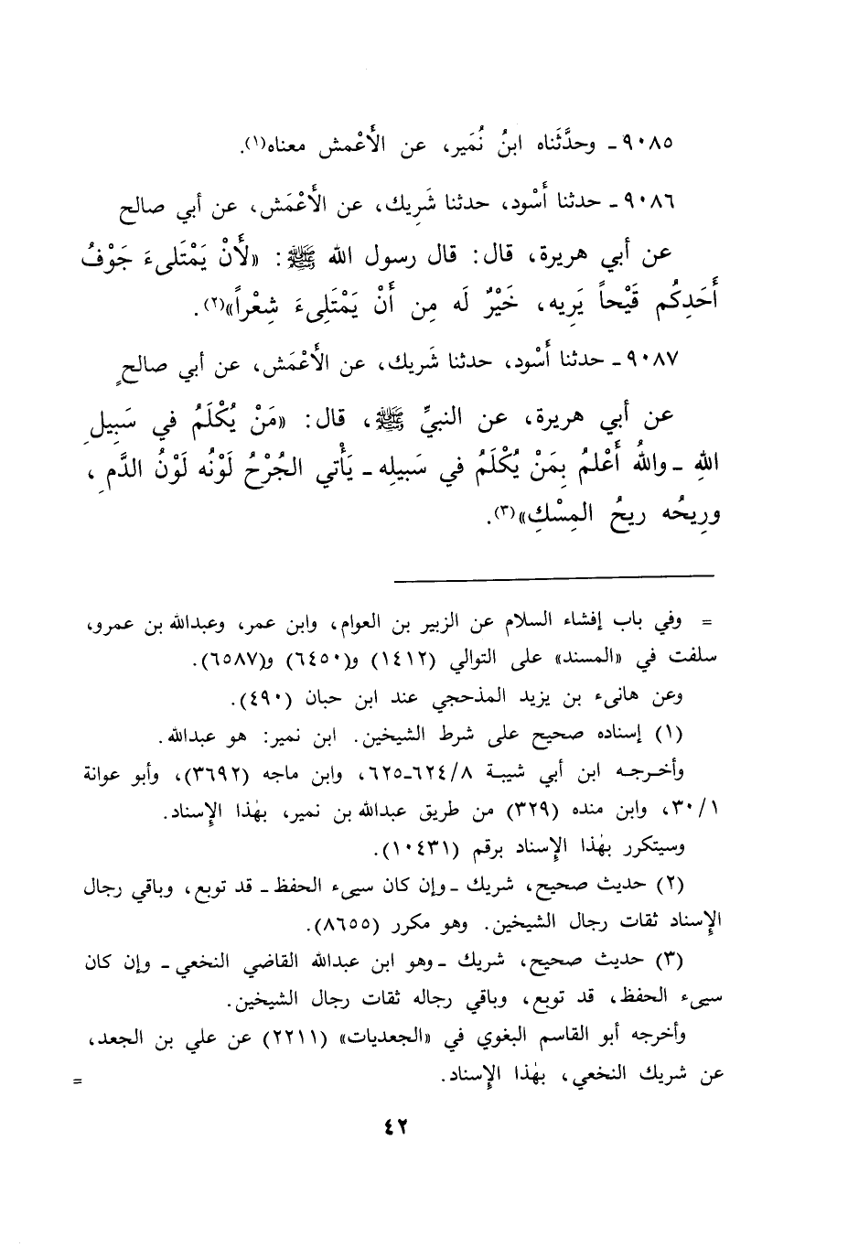 ٩٠٨٧ - حَدَّثَنَا أَسْوَدُ، حَدَّثَنَا شَرِيكٌ، عَنِ الْأَعْمَشِ، عَنْ أَبِي صَالِحٍ، عَنْ أَبِي هُرَيْرَةَ، عَنِ النَّبِيِّ صَلَّى اللهُ عَلَيْهِ وَسَلَّمَ قَالَ: " مَنْ يُكْلَمُ فِي سَبِيلِ اللهِ، وَاللهُ أَعْلَمُ بِمَنْ يُكْلَمُ فِي سَبِيلِهِ، يَأْتِي الْجُرْحُ لَوْنُهُ لَوْنُ الدَّمِ، وَرِيحُهُ رِيحُ الْمِسْكِ " (٣)