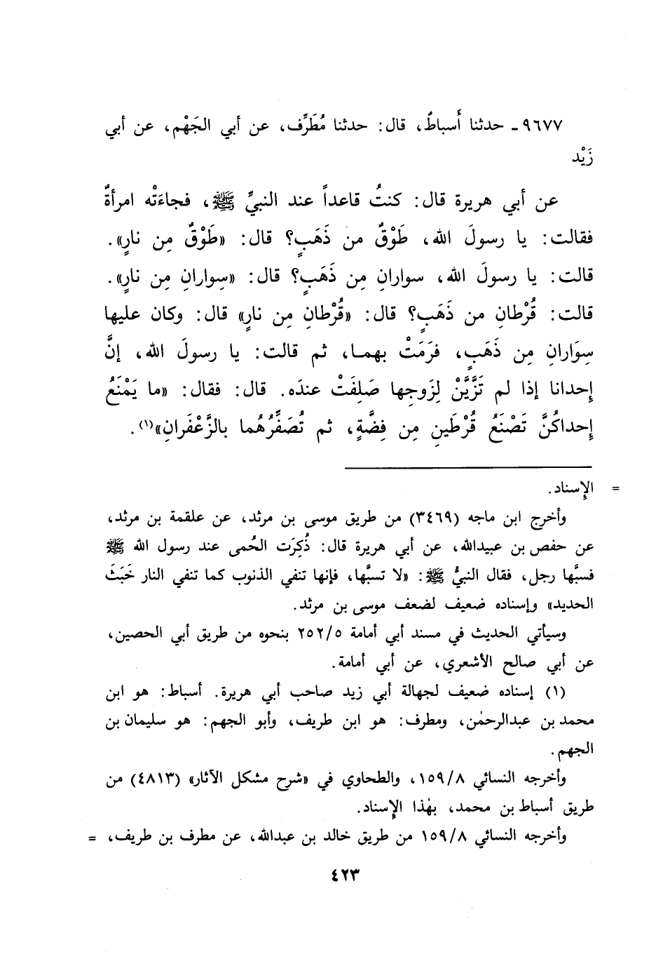٩٦٧٧ - حَدَّثَنَا أَسْبَاطٌ، قَالَ: حَدَّثَنَا مُطَرِّفٌ، عَنْ أَبِي الْجَهْمِ، عَنْ أَبِي زَيْدٍ، عَنْ أَبِي هُرَيْرَةَ قَالَ: كُنْتُ قَاعِدًا عِنْدَ النَّبِيِّ صَلَّى اللهُ عَلَيْهِ وَسَلَّمَ فَجَاءَتْهُ امْرَأَةٌ، فَقَالَتْ: يَا رَسُولَ اللهِ، طَوْقٌ مِنْ ذَهَبٍ؟ قَالَ: " طَوْقٌ مِنْ نَارٍ "، قَالَتْ: يَا رَسُولَ اللهِ، سِوَارَانِ مِنْ ذَهَبٍ؟ قَالَ: " سِوَارَانِ مِنْ نَارٍ "، قَالَتْ: قُرْطَانِ مِنْ ذَهَبٍ؟ قَالَ: " قُرْطَانِ مِنْ نَارٍ "، قَالَ: وَكَانَ عَلَيْهَا سِوَارَانِ مِنْ ذَهَبٍ، فَرَمَتْ بِهِمَا، ثُمَّ قَالَتْ: يَا رَسُولَ اللهِ، إِنَّ إِحْدَانَا إِذَا لَمْ تَزَّيَّنْ لِزَوْجِهَا صَلِفَتْ عِنْدَهُ، قَالَ: فَقَالَ: " مَا يَمْنَعُ إِحْدَاكُنَّ تَصْنَعُ قُرْطَيْنِ مِنْ فِضَّةٍ، ثُمَّ تُصَفِّرُهُمَا بِالزَّعْفَرَانِ " (١)