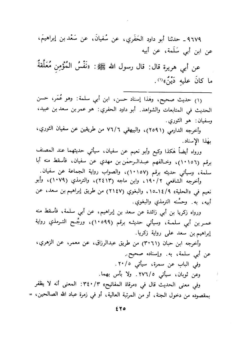٩٦٧٩ - حَدَّثَنَا أَبُو دَاوُدَ الْحَفَرِيُّ، عَنْ سُفْيَانَ، عَنْ سَعْدِ بْنِ إِبْرَاهِيمَ، عَنِ ابْنِ أَبِي سَلَمَةَ، عَنْ أَبِيهِ، عَنْ أَبِي هُرَيْرَةَ، قَالَ: قَالَ رَسُولُ اللهِ صَلَّى اللهُ عَلَيْهِ وَسَلَّمَ: " نَفْسُ الْمُؤْمِنِ مُعَلَّقَةٌ مَا كَانَ عَلَيْهِ دَيْنٌ " (١)