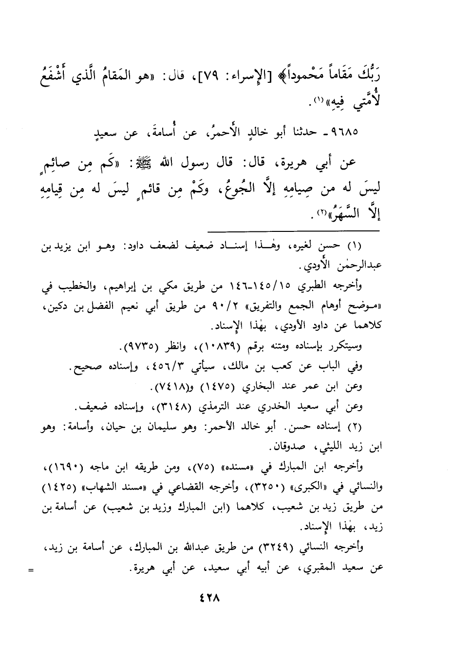 ٩٦٨٥ - حَدَّثَنَا أَبُو خَالِدٍ الْأَحْمَرُ، عَنْ أُسَامَةَ، عَنْ سَعِيدٍ، عَنْ أَبِي هُرَيْرَةَ، قَالَ: قَالَ رَسُولُ اللهِ صَلَّى اللهُ عَلَيْهِ وَسَلَّمَ: " كَمْ مِنْ صَائِمٍ لَيْسَ لَهُ مِنْ صِيَامِهِ إِلَّا الْجُوعُ، وَكَمْ مِنْ قَائِمٍ لَيْسَ لَهُ مِنْ قِيَامِهِ إِلَّا السَّهَرُ " (٢)