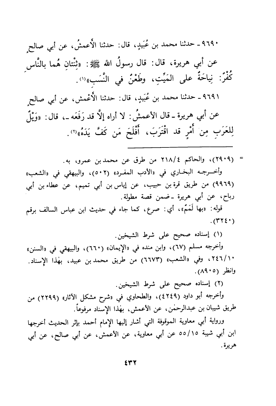 ٩٦٩٠ - حَدَّثَنَا مُحَمَّدُ بْنُ عُبَيْدٍ، قَالَ: حَدَّثَنَا الْأَعْمَشُ، عَنْ أَبِي صَالِحٍ، عَنْ أَبِي هُرَيْرَةَ، قَالَ: قَالَ رَسُولُ اللهِ صَلَّى اللهُ عَلَيْهِ وَسَلَّمَ: " ثِنْتَانِ هُمَا بِالنَّاسِ كُفْرٌ: نِيَاحَةٌ عَلَى الْمَيِّتِ، وَطَعْنٌ فِي النَّسَبِ " (١)
