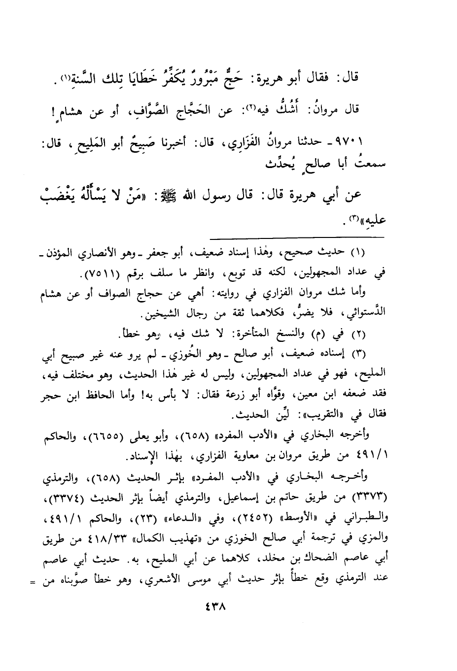 ٩٧٠١ - حَدَّثَنَا مَرْوَانُ الْفَزَارِيُّ، قَالَ: أَخْبَرَنَا صَبِيحٌ أَبُو الْمَلِيحِ، قَالَ: سَمِعْتُ أَبَا صَالِحٍ، يُحَدِّثُ عَنْ أَبِي هُرَيْرَةَ، قَالَ: قَالَ رَسُولُ اللهِ صَلَّى اللهُ عَلَيْهِ وَسَلَّمَ: " مَنْ لَا يَسْأَلْهُ يَغْضَبْ عَلَيْهِ " (٣)
