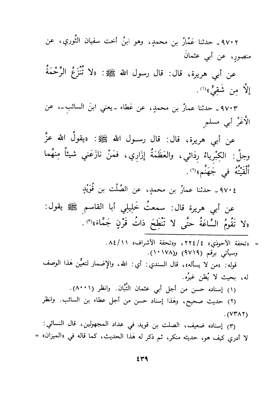 ٩٧٠٢ - حَدَّثَنَا عَمَّارُ بْنُ مُحَمَّدٍ، وَهُوَ ابْنُ أُخْتِ سُفْيَانَ الثَّوْرِيِّ، عَنْ مَنْصُورٍ، عَنْ أَبِي عُثْمَانَ، عَنْ أَبِي هُرَيْرَةَ، قَالَ: قَالَ رَسُولُ اللهِ صَلَّى اللهُ عَلَيْهِ وَسَلَّمَ: " لَا تُنْزَعُ الرَّحْمَةُ إِلَّا مِنْ شَقِيٍّ " (١)