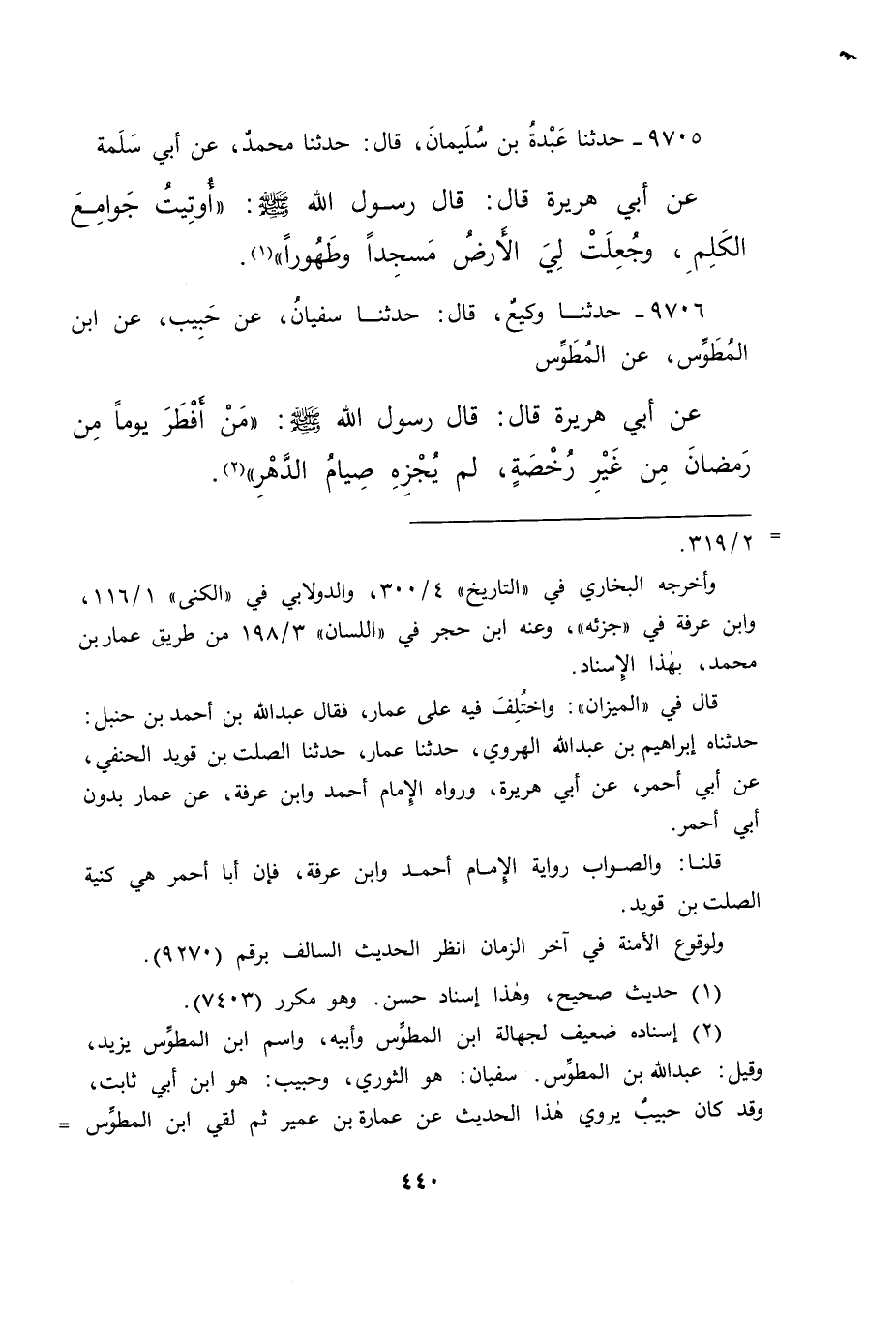 ٩٧٠٦ - حَدَّثَنَا وَكِيعٌ، قَالَ: حَدَّثَنَا سُفْيَانُ، عَنْ حَبِيبٍ، عَنِ ابْنِ الْمُطَوِّسِ، عَنِ الْمُطَوِّسِ، عَنْ أَبِي هُرَيْرَةَ، قَالَ: قَالَ رَسُولُ اللهِ صَلَّى اللهُ عَلَيْهِ وَسَلَّمَ: " مَنْ أَفْطَرَ يَوْمًا مِنْ رَمَضَانَ، مِنْ غَيْرِ رُخْصَةٍ، لَمْ يَجْزِهِ صِيَامُ الدَّهْرِ " (٢)
